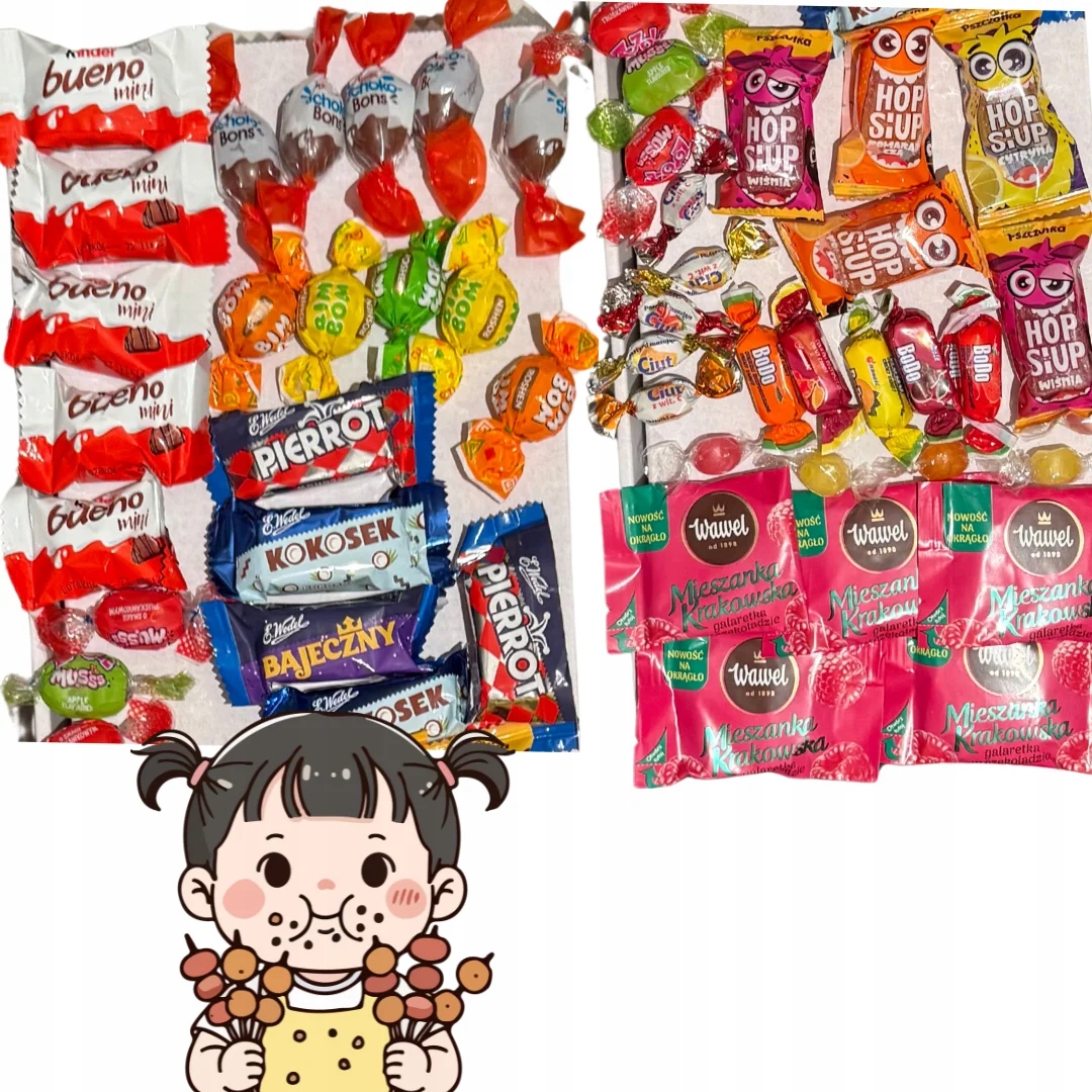 <ул> <ли> 🍫 Киндер Буэно Мини – нежная вафля с ореховым кремом в шоколаде (около 5,4 г/шт.) <ли> 🍬 Киндер Шоко-Бонс – культовые молочно-ореховые конфеты (около 7 г/шт.) <ли> 🍭 Jedność Bodo – конфеты растворимые со случайным фруктовым вкусом (около 6 г/шт.) <ли> 🍏 Зозол – классика детства! Яблоко, вишня или клубника (ок. 6 г/шт.) <ли> 🍓 Wawel Mieszanka Krakowska – Malina – мягкое желе в шоколаде (ок. 17 г/шт.) <ли> 🍫Э. Wedel Mieszanka Wedelowska – случайная конфета из классического шоколада Wedel (около 13 г/шт.) <ли> 🍋 Rioba Mini Fruity – маленькие конфеты с насыщенным фруктовым вкусом (около 2 г/шт.) <ли> 🍒 Roshen Bim-Bom – конфеты с жидкой фруктовой начинкой (около 8 г/шт.) <ли> 🍇 Pszczółka Hop Siup – фруктовое желе в шоколаде (ок. 15 г/шт.) <ли> 🍊 Jedność Ciut 2 таблетки с витамином С – нежные, освежающие таблетки (около 2 г/шт.)