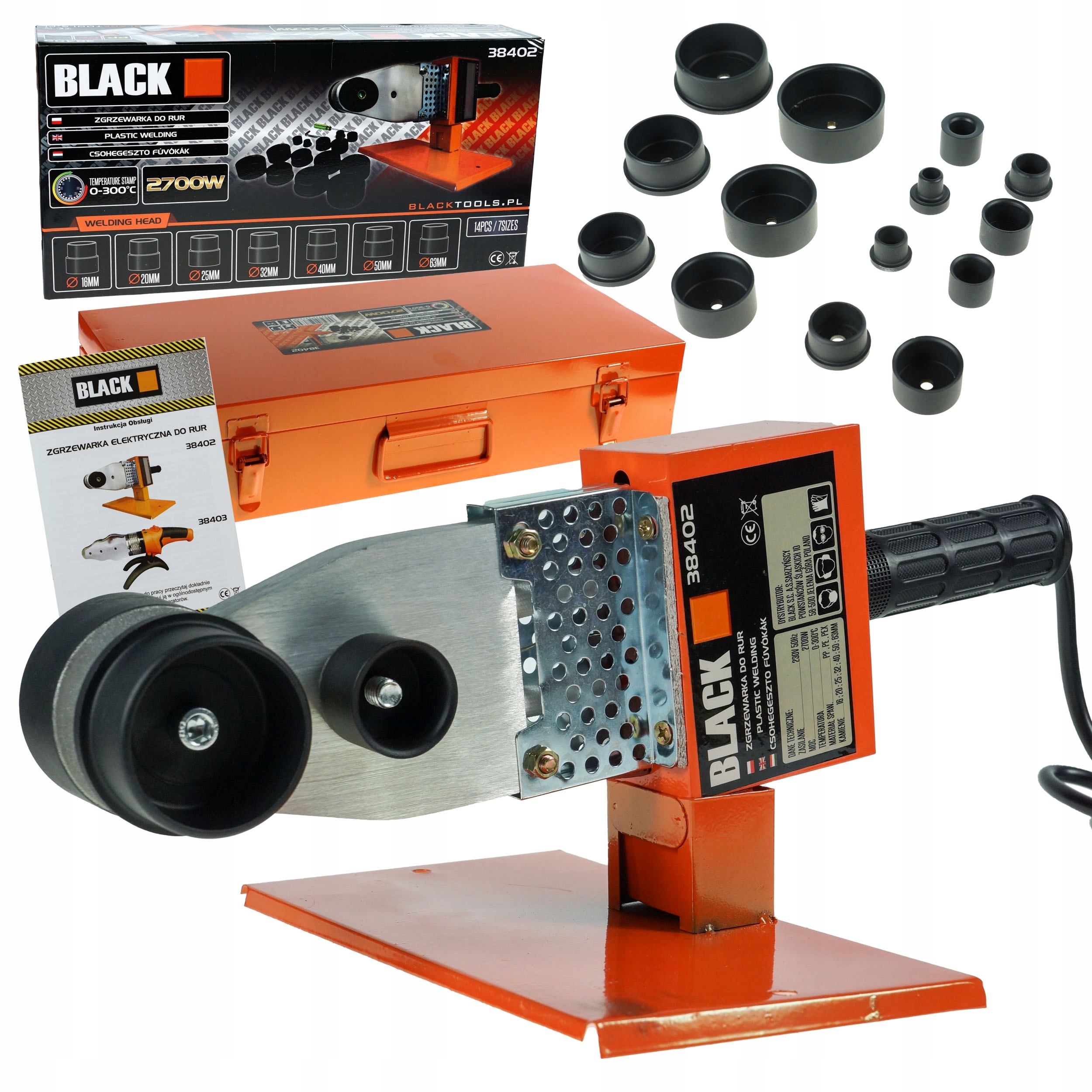 В комплект входят 7 нагревательных штырей и муфты, позволяющие работать с трубами и фитингами диаметром: 16, 20, 25, 32, 40, 50 и 63 мм. Муфты покрыты тефлоновым покрытием, что позволяет осуществлять еще более точные соединения