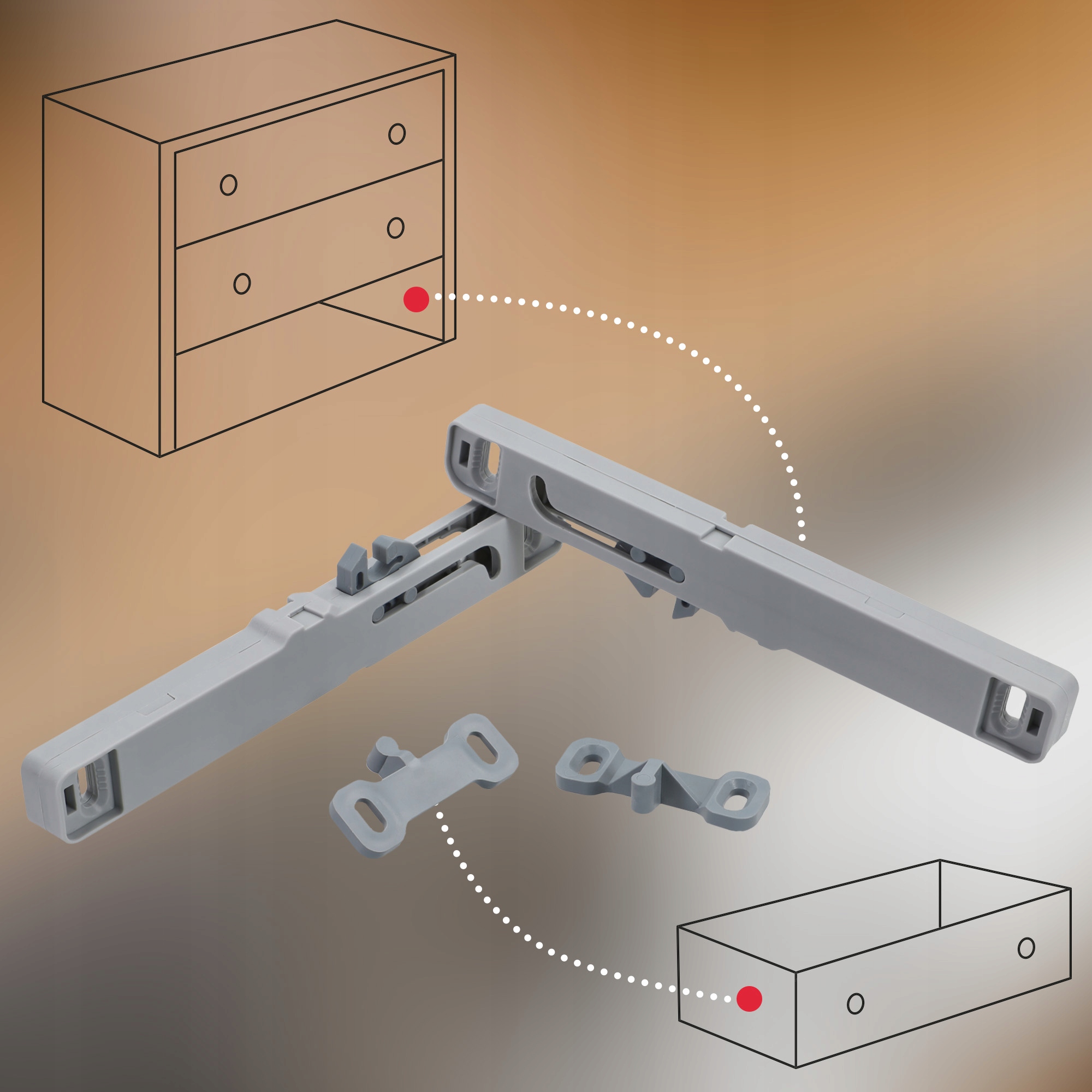 Box Slim для роликовых направляющих из нашего предложения – это универсальный тормоз, созданный специально для перемещения ящиков по роликовым направляющим. Оптимальная ширина конструкции позволяет легко разместить ее между ящиком и корпусом мебели.