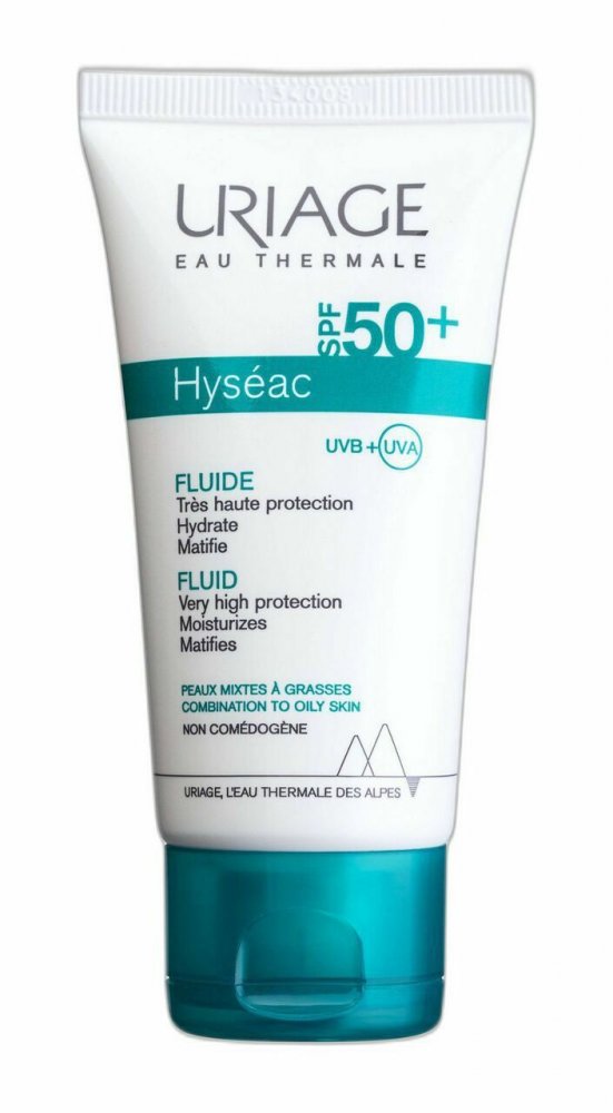 Жидкий Hyséac SPF50+ сочетает в себе эффективную защиту от солнца с свойствами ухода, выбранными для потребностей жирной и комбинированной кожи. Он обеспечивает очень высокую защиту от вредного воздействия UVA и UVB -радиации благодаря содержанию нового, эффективного солнцезащитного комплекса без октиклина. У него плохая консистенция, не оставляет липкого слоя на поверхности кожи.