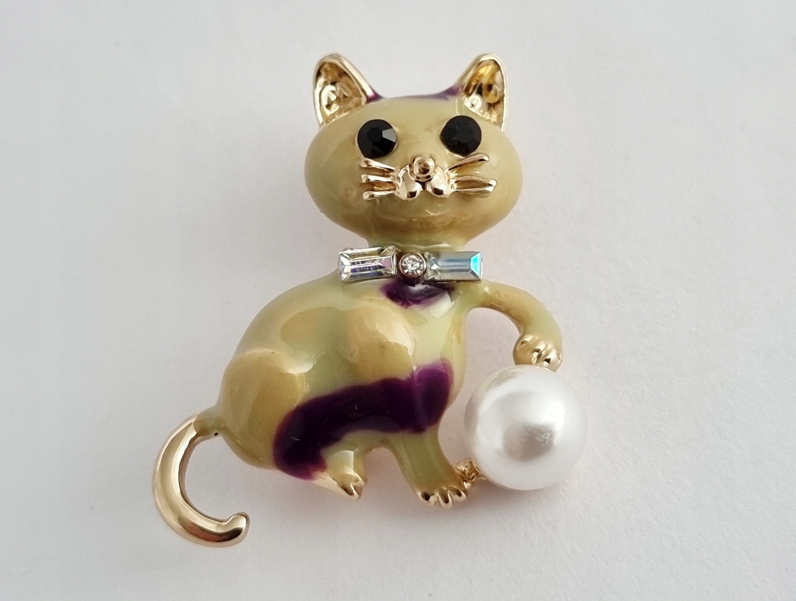 UROCZA BROSZKA CYRKONIE EMALIA KOT Z PERŁOWĄ PIŁKĄ