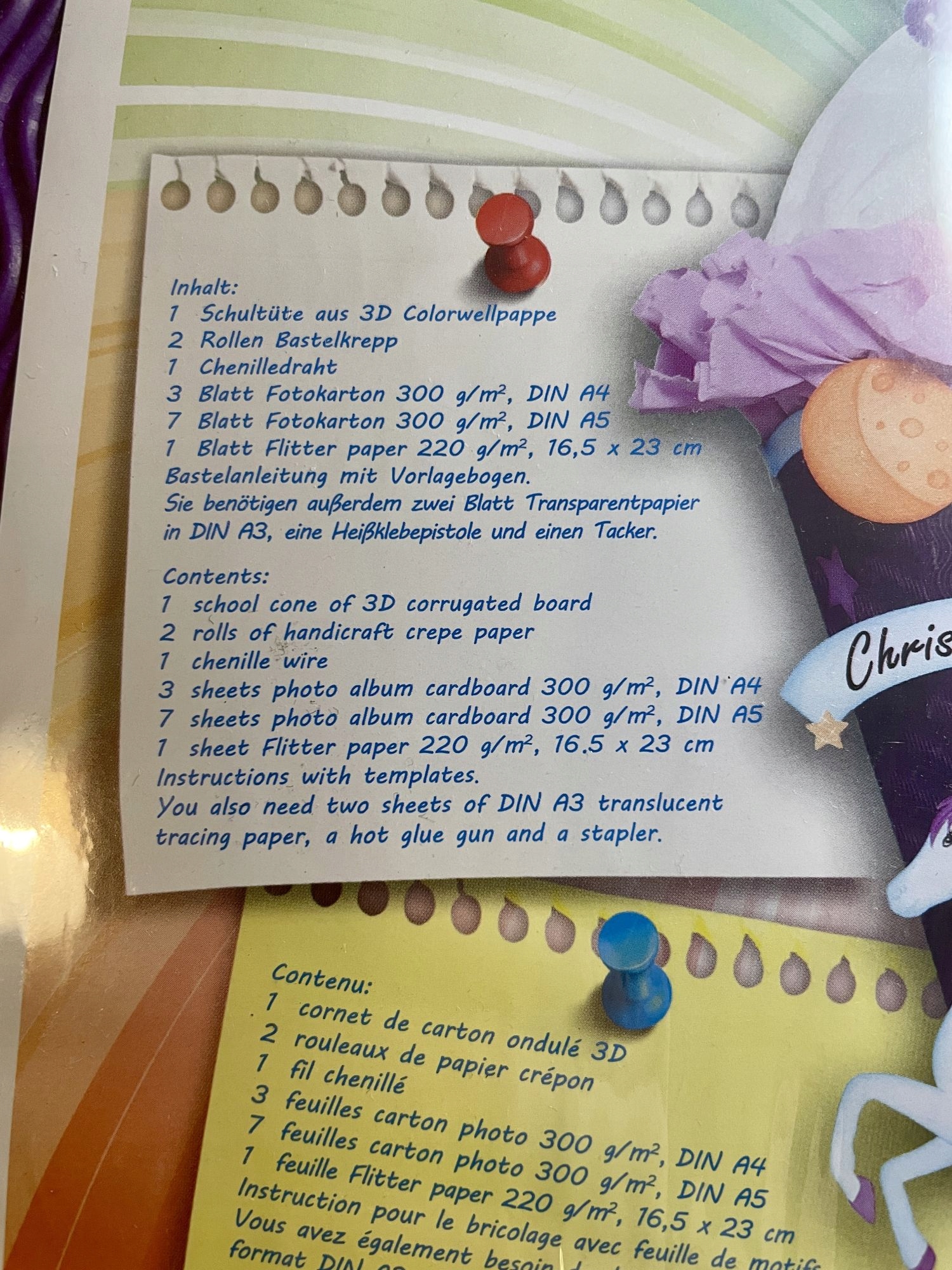 - in the middle of the cone: plastic materials such as glitter, crepe, handball ornaments (list in the last photo, shown in the 2nd photo)
