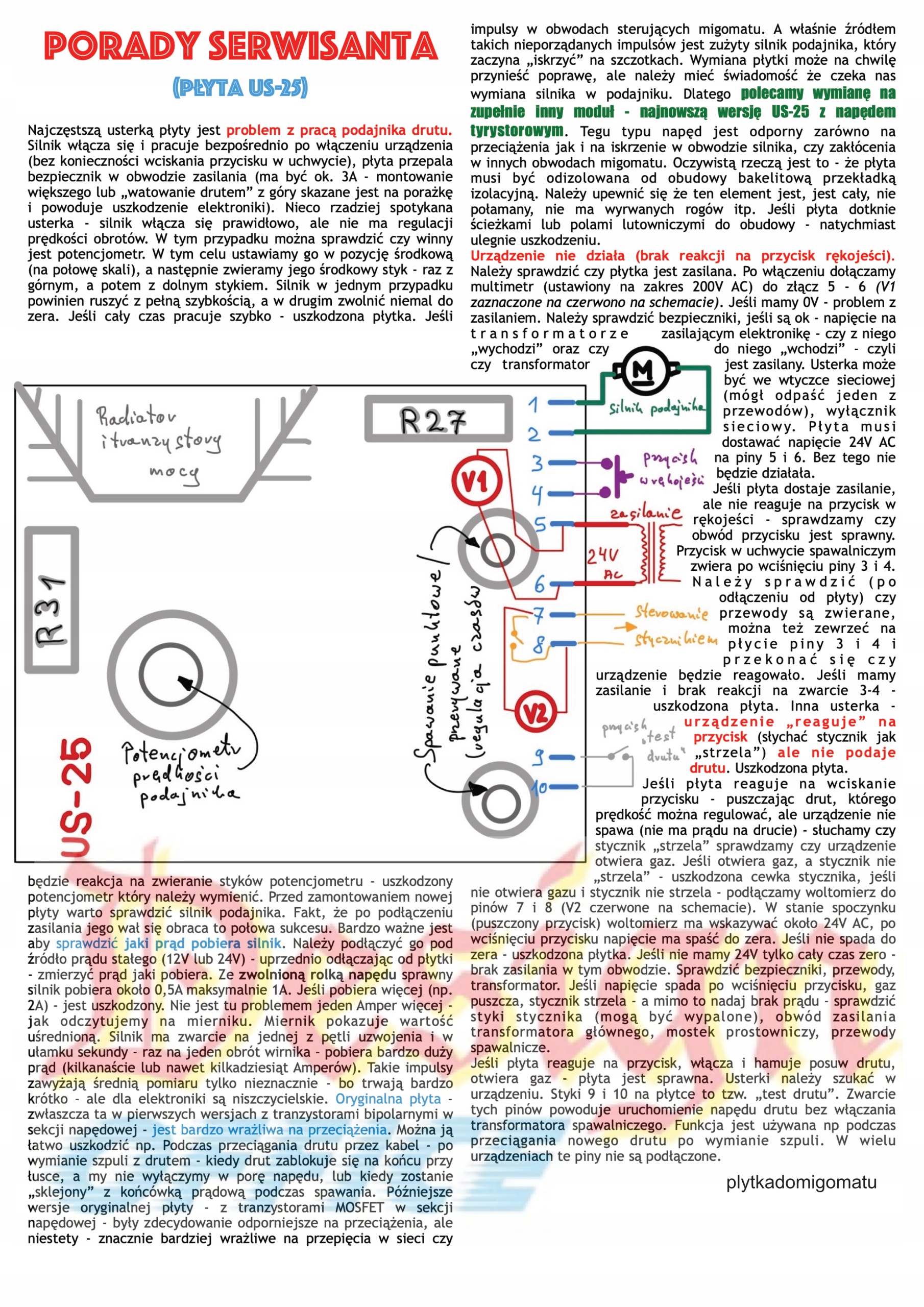 Не секрет (и многие пользователи испытали это «на своем опыте»), что плата УС-25, будь то оригинальная версия или ее замена, «совместимая с оригиналом», является чувствителен к перегрузкам, износу двигателя фидера и перенапряжениям в электросети. Известны случаи повреждения пластины в результате, например, "склеивания" проволоки в держателе - с контактным наконечником - и, несмотря на это, попыток подачи проволоки с помощью моторного привода (намеренно или случайно ), частичный износ двигателя подачи, заключающийся в износе коллектора, частичный износ щеток, запыление внутреннего пространства двигателя пылью от щеток, вызывают повышенное энергопотребление и большую нагрузку на систему управления, которая чувствительна к перегрузкам. Также изношенная или загрязненная вставка сварочного кабеля, редко используемая и покрытая сварочная проволока, использование более длинного сварочного кабеля – все это увеличивает энергопотребление механизма подачи и, как следствие, увеличивает риск повреждения платы управления.