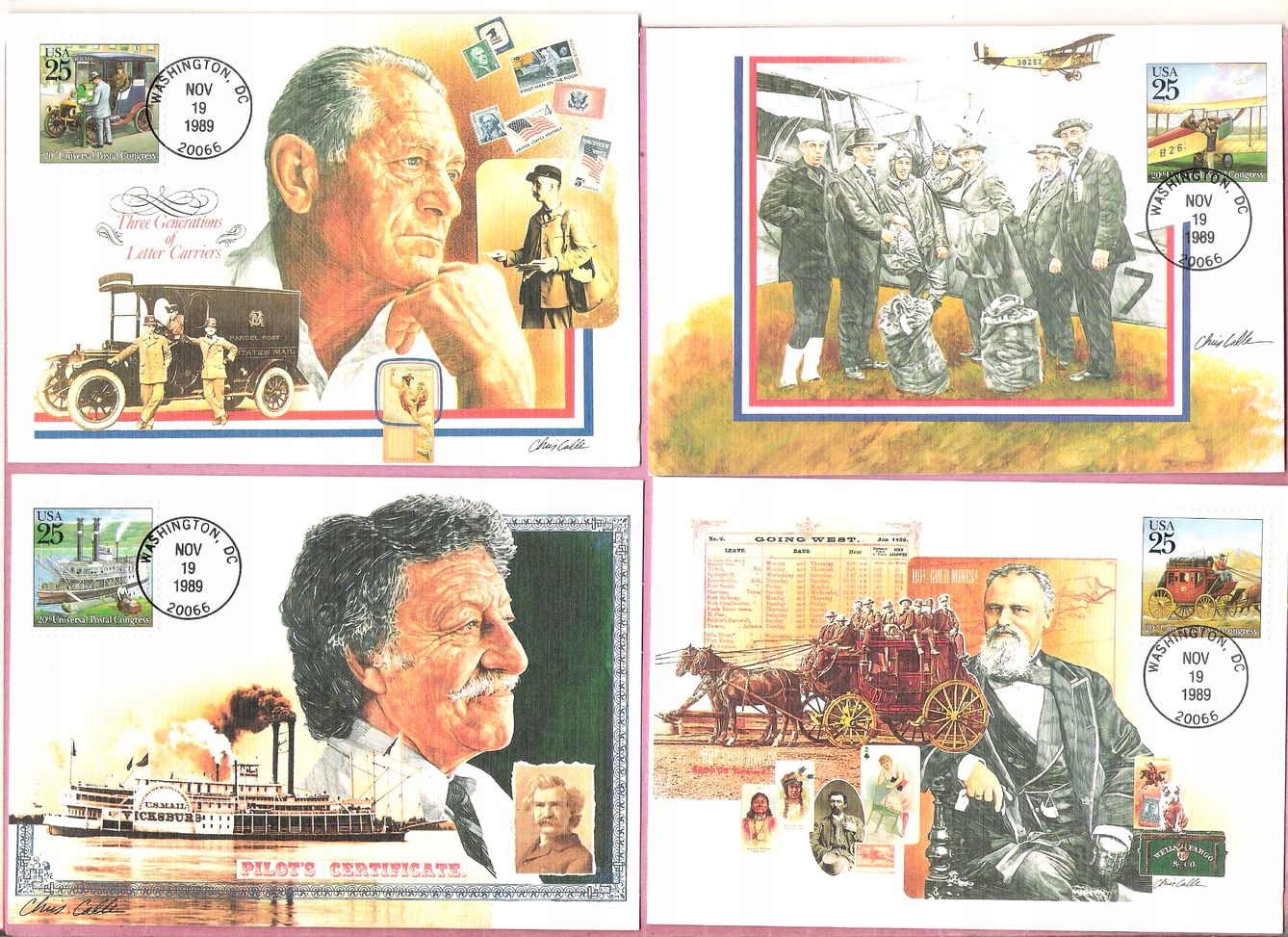 USA 1989 MC FDC 4x, dawny transport poczty samochód samolot statek dyliżans