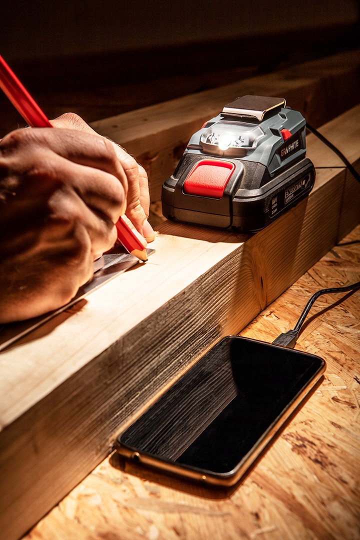 USB-адаптер - Фонарик Energy LED представляет собой небольшое устройство, выполняющее две функции. Присоединив адаптер к любому аккумулятору Energy, мы получаем светодиодный фонарик, освещающий рабочее место. Вторая функция — это Powerbank, который можно использовать для питания или зарядки внешних устройств через порт USB. Зарядка внешних устройств для повышения безопасности использования контролируется электронным модулем и по ее окончании функция Powerbank переходит в спящий режим. Дополнительная металлическая клипса позволяет прикрепить к ремню адаптер с установленным аккумулятором.