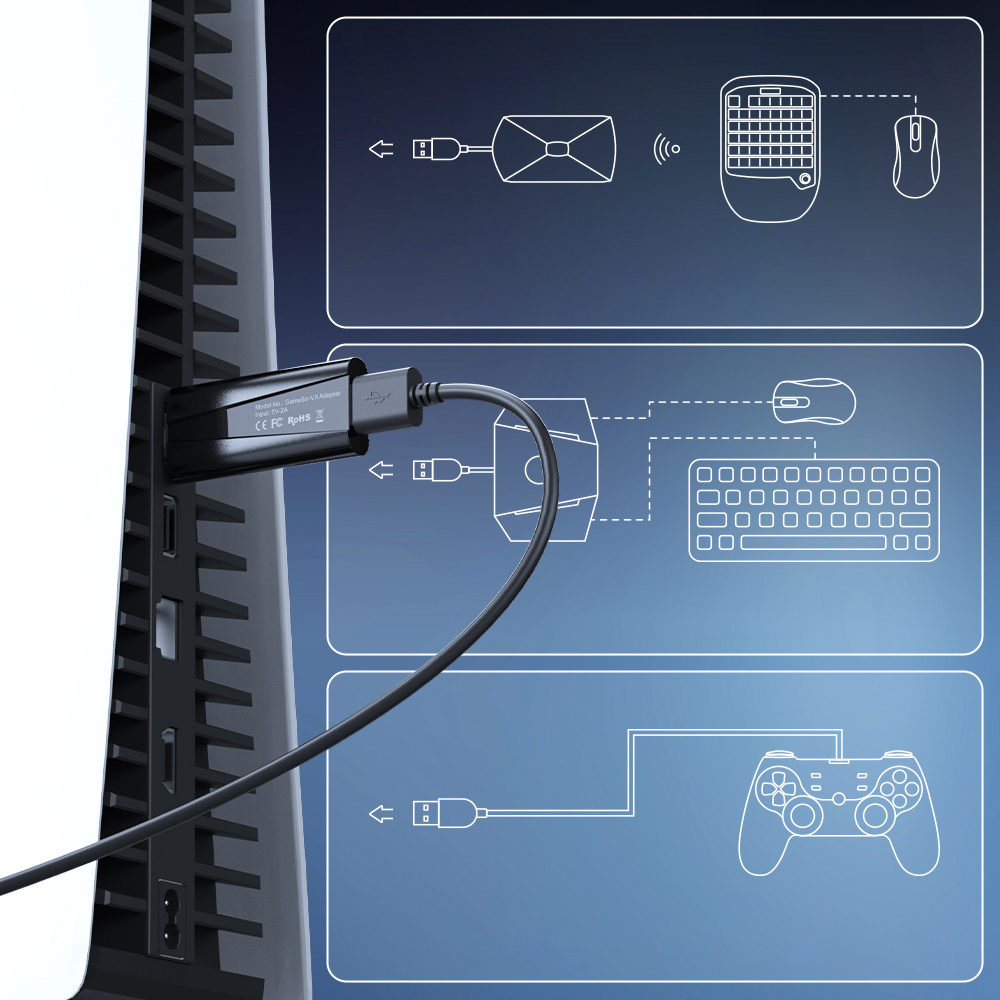 После успешной настройки адаптер GameSir VX можно подключить к заднему USB-порту PS5, источнику питания 5 В, 2 А, блоку питания, а также портативному блоку питания.