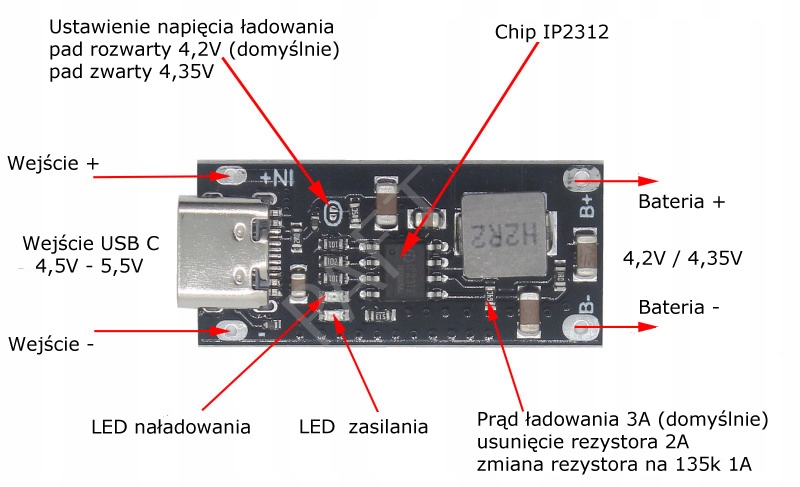 Li-Ion / Li-POL 5V 3A USB-C-C IP2312 Модуль зарядки ячейки