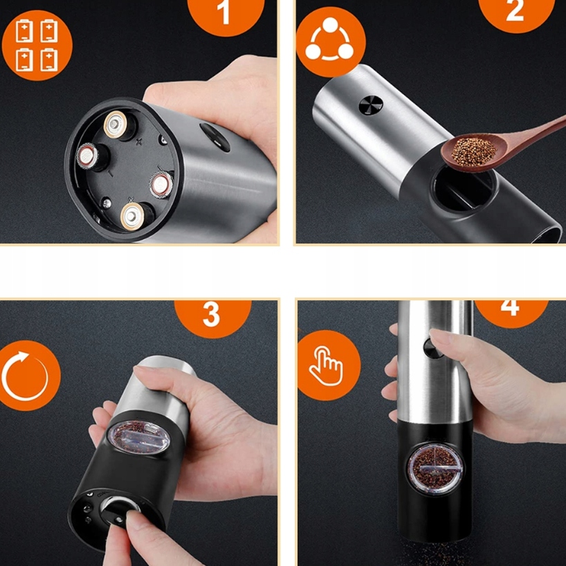 Электрическая шлифовальная машина: новая опыт, больше не нужно измельчать вручную, просто нажмите и удерживайте кнопку переключателя, чтобы измельчить автоматически, специи не застрянут. Управление одной рукой: насыпьте перец или соль в контейнер, нажмите и удерживайте кнопку, чтобы эффективно измельчить, а другой рукой смешайте пищу с солью или перцем. Материал из нержавеющей стали: материал очень легко чистится, не боится масляных пятен.