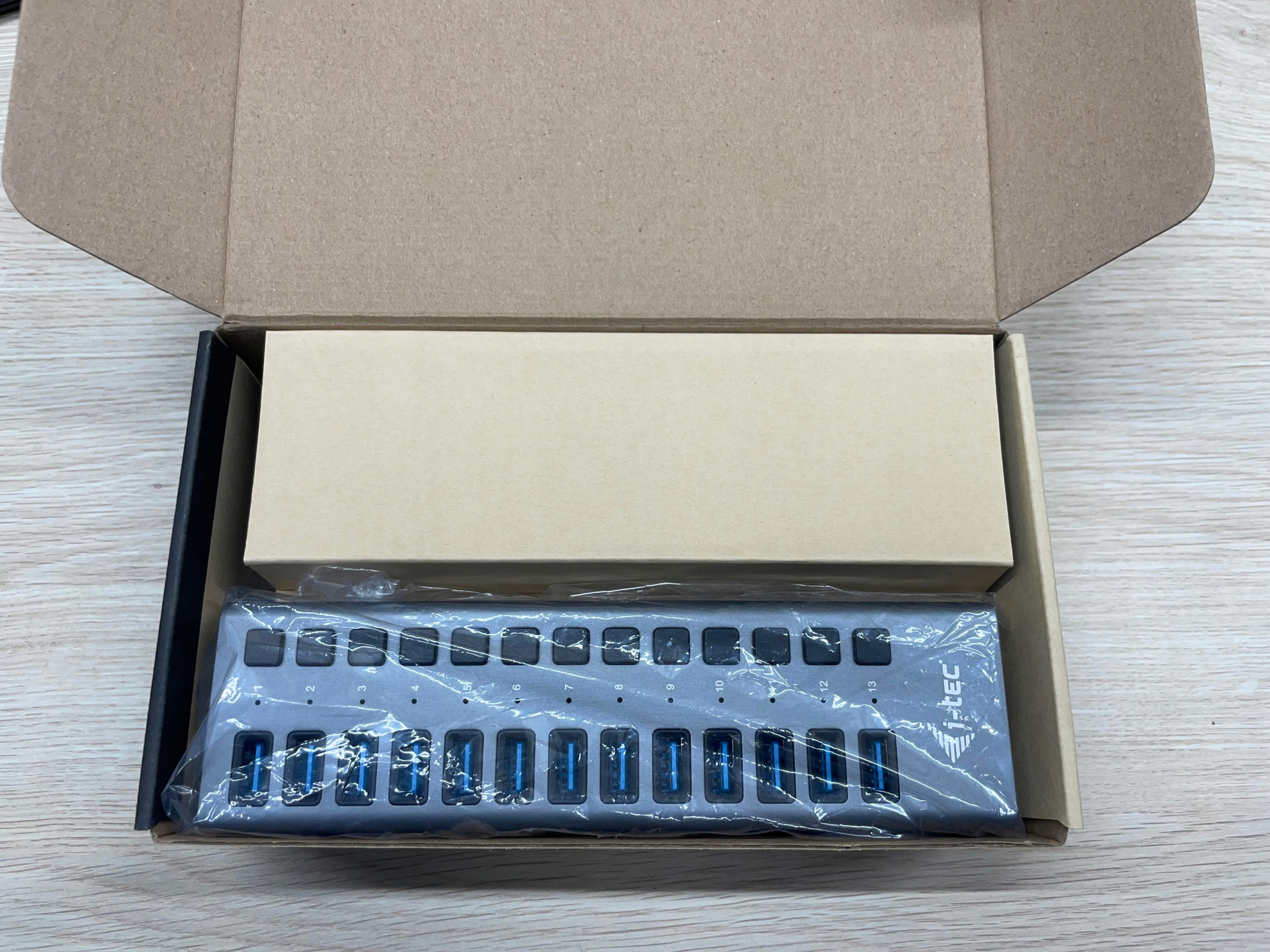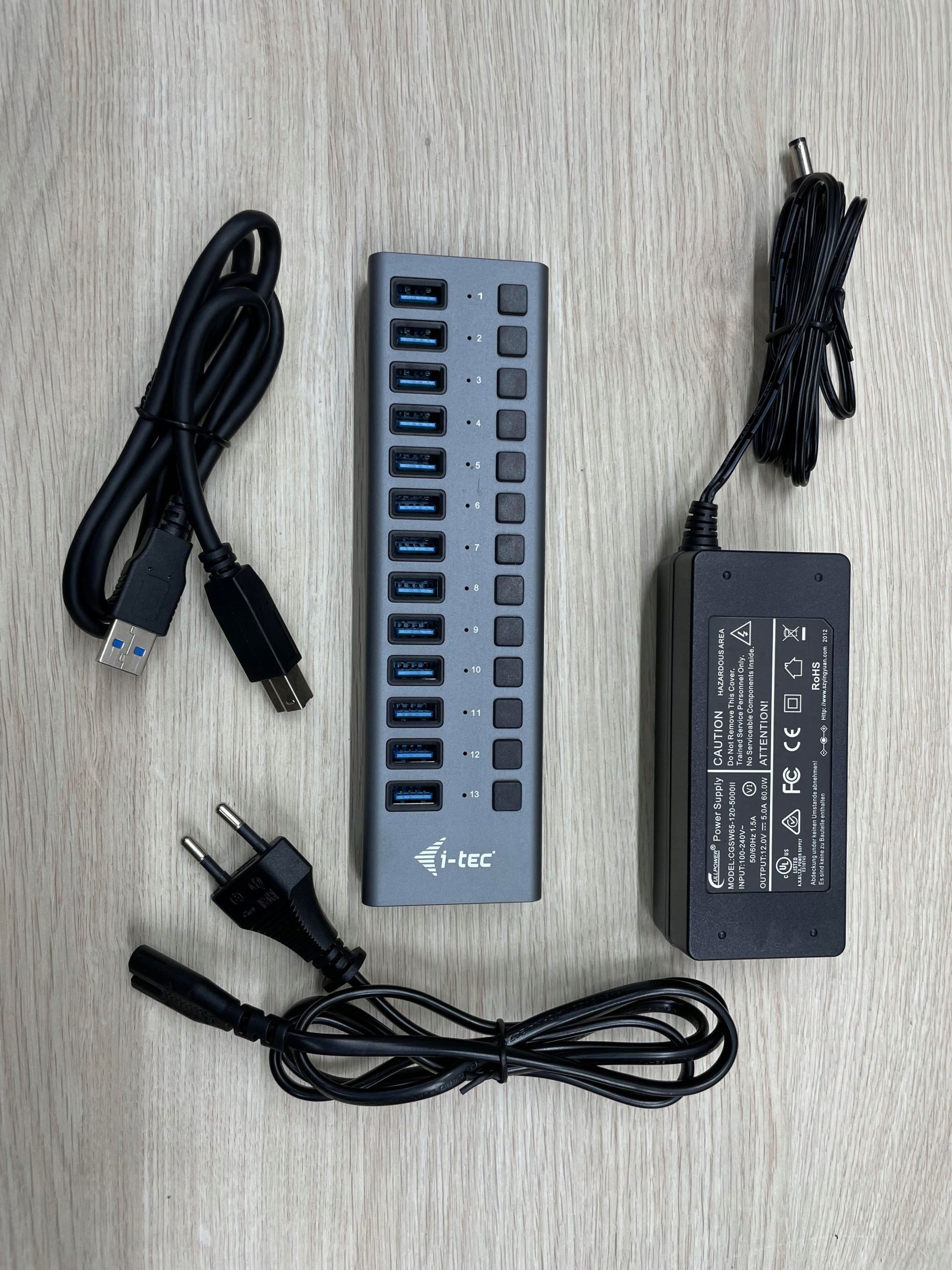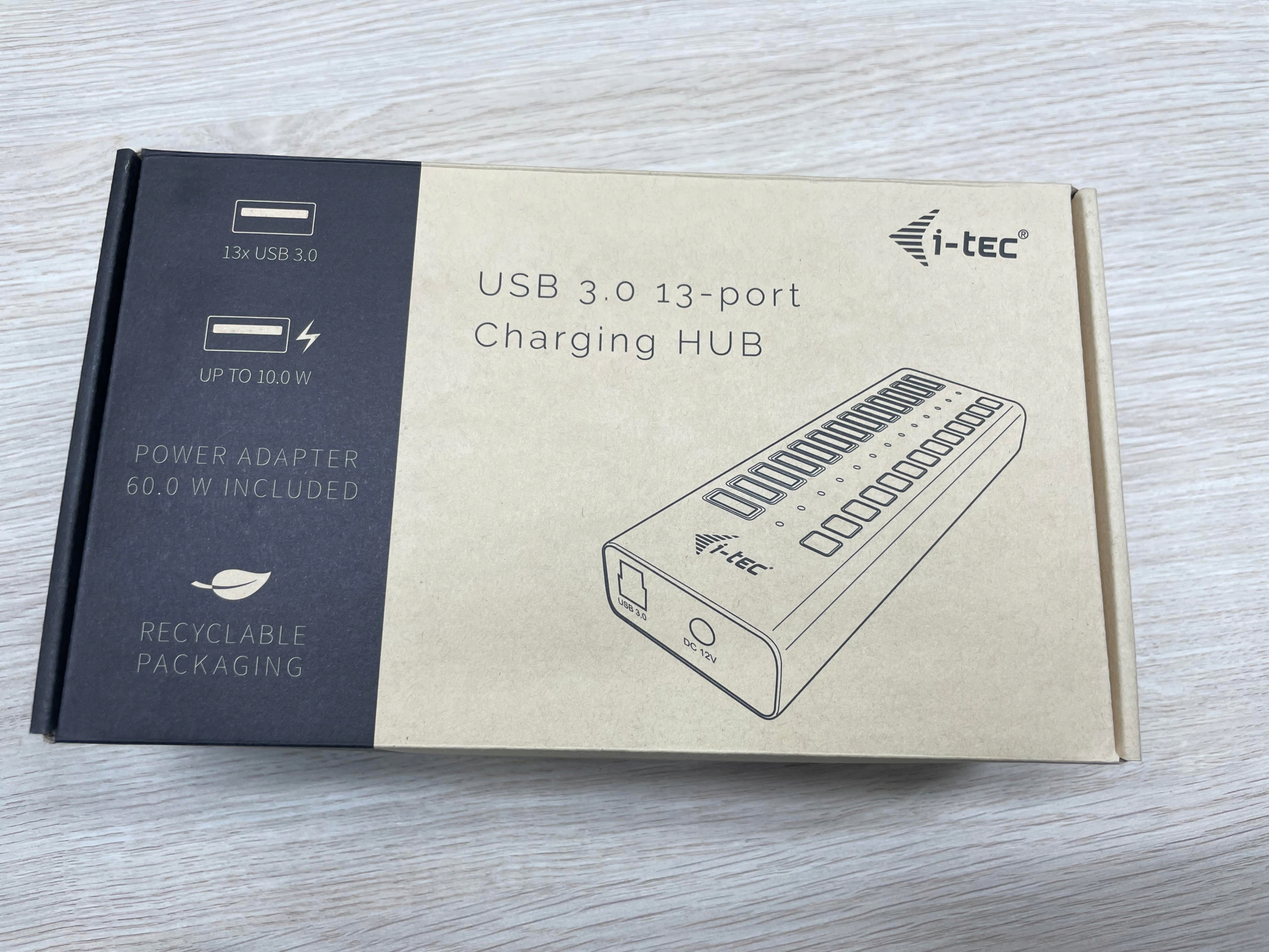 Hub i-tec предлагает тринадцать портов USB 3.0 с функцией Plug & Play и стандартной зарядкой через USB, автоматически определяя подключенное устройство. Концентратор может заряжать до 13 устройств одновременно, а интерфейс USB 3.0 особенно полезен при передаче данных с внешних накопителей. В комплект входит внешний источник питания, гарантирующий эффективность зарядки от портов USB, обеспечивая общую мощность до 60 Вт.