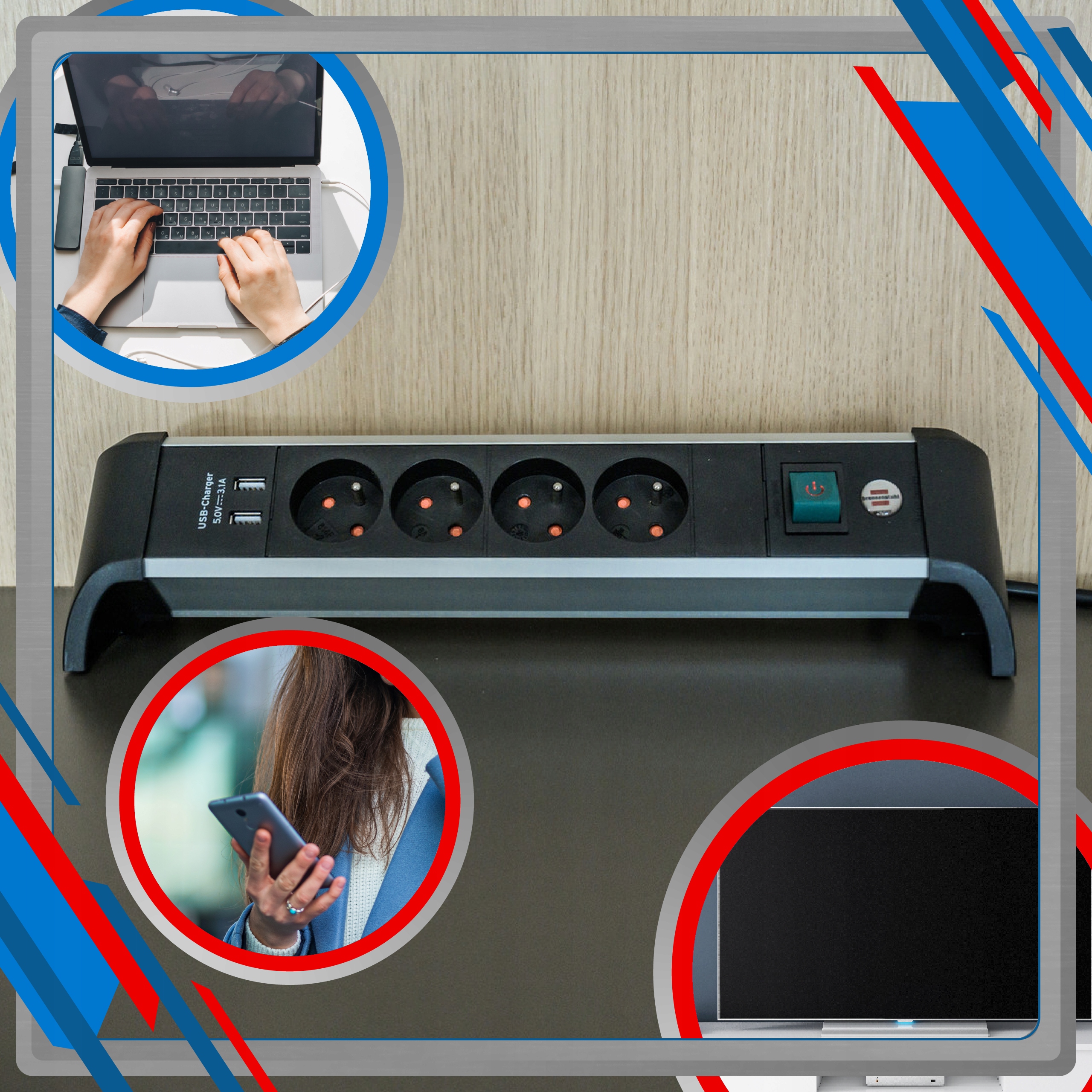 Удлинитель Alu-Office-Line отличается очень продуманной конструкцией. Он имеет розетки, расположенные под углом 45°, что позволяет оптимально использовать пространство и одновременно снабжать питанием до 6 устройств!