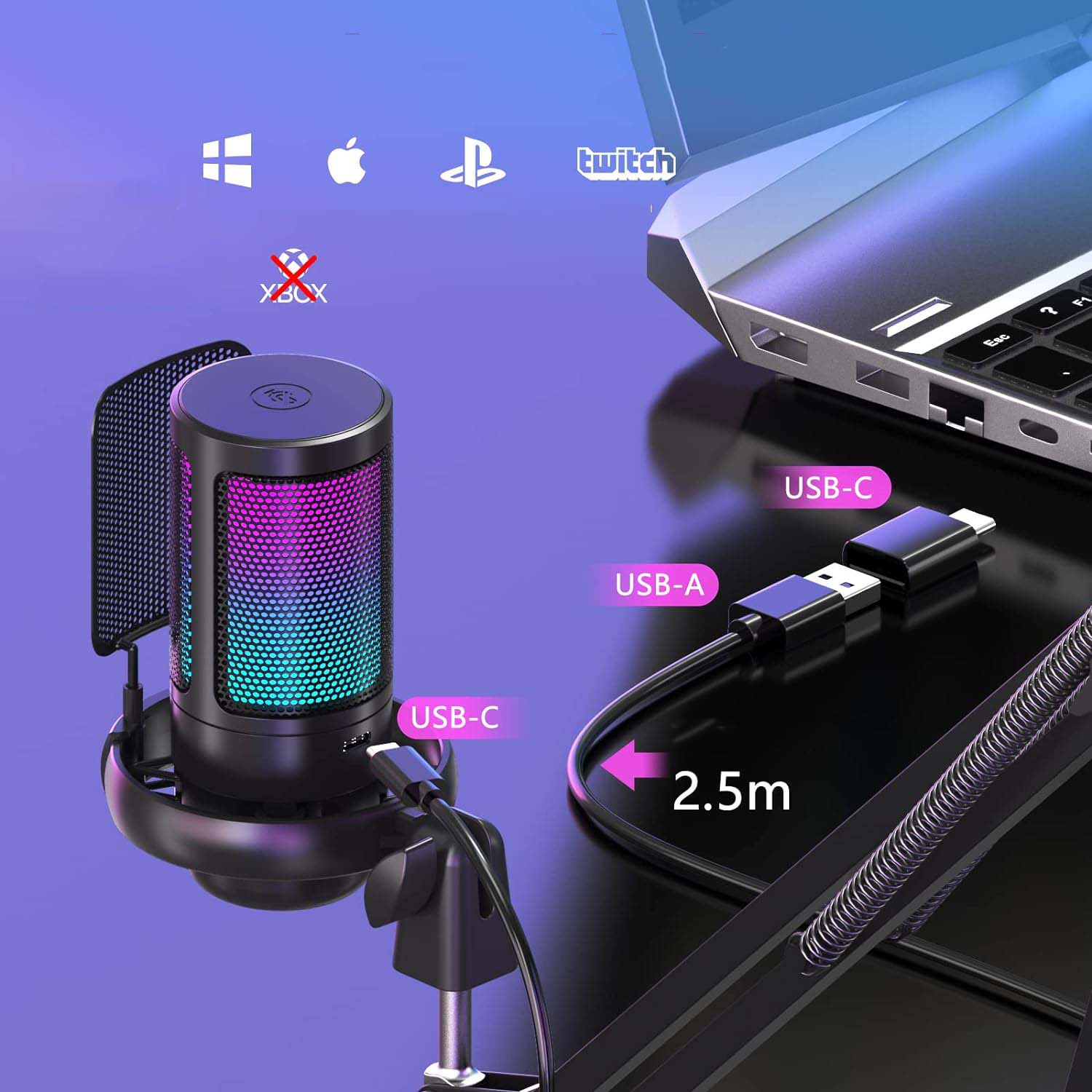 - Этот потоковый игровой микрофон работает с ПК, ноутбуком, Macbook, PS4/5 или всеми телефонами, планшетами и компьютерами Type-C (требуется адаптер USB-C на USB — в комплект входит).