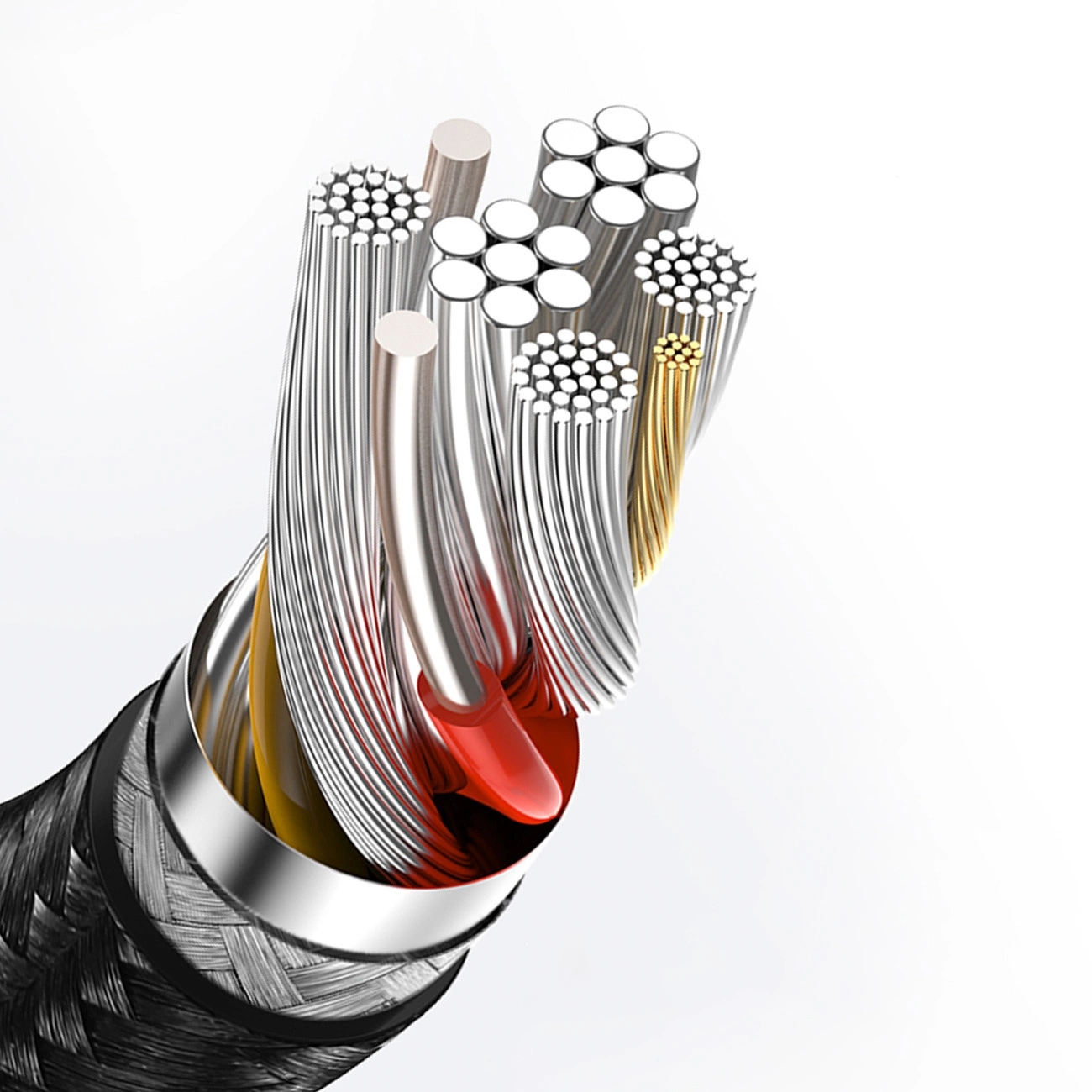 Кабель укрепляется слоем TPE и нейлонового материала, одновременно увеличивая сопротивление механическим повреждениям.