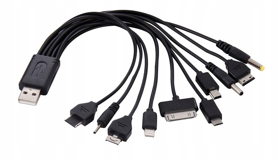 Универсальное зарядное устройство — USB-кабель с 10 разъемами, который заряжает большинство мобильных телефонов (iPod 30-контактный; Samsung comte 20-контактный; LG 18-контактный; Samsung 20-контактный; Micro USB; Nokia). 2.0; Nokia 3, 5; Sony Ericsson, mini USB, PSP и другие), MP3/4-плееры, GPS и т. д.