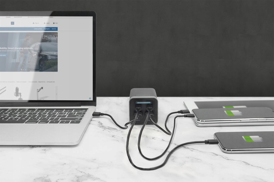 - Компактное зарядное устройство для устройств например ноутбуки, смартфоны или планшеты; новейшая технология GaN чрезвычайно эффективна и может заряжать устройства до четырех раз быстрее, чем обычные зарядные устройства,