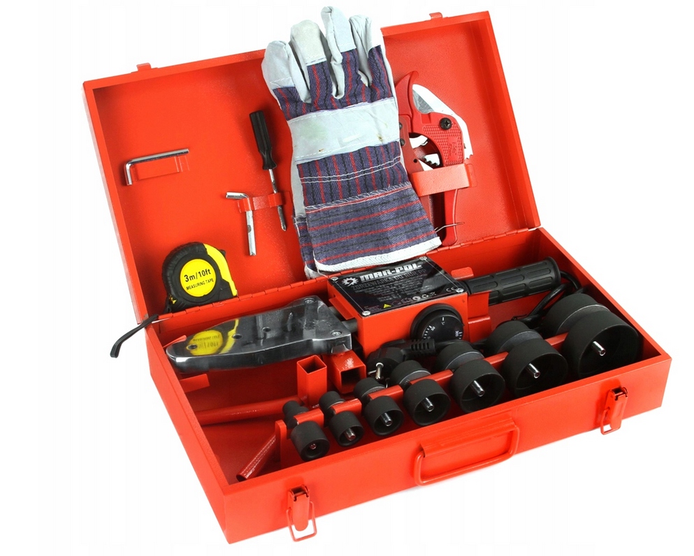 Сварщик оснащен двумя нагревателями, благодаря чему нагрев двухступенчатый, включается двумя переключателями. Устройство также оснащено электронным терморегулятором с термостатом, работающим в диапазоне 50-300°С. Корпус сварочного аппарата изготовлен из металла, что делает его устойчивым к повреждениям и износу даже при высоких температурах. Сварочный аппарат идеально подходит для домашнего ремонта, а также для более широкого использования на крупных объектах. Входящие в комплект нагревательные матрицы позволяют работать с трубами диаметром 16мм, 20мм, 25мм, 32мм, 40мм, 50мм и 63мм. Каждая матрица покрыта тефлоновым покрытием, что обеспечивает высокое качество соединений.