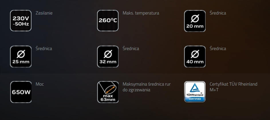 Сварочный аппарат NEO для пластиковых труб ПЭ, ПП, ПБ, 650Вт. Для сварки рукавов, труб и фитингов диаметром до 40 мм. В комплект поставки входят 4 нагревательные гильзы диаметром 20, 25, 32, 40 мм. Втулки покрыты тефлоновым покрытием, продлевающим срок их службы. Температура сварочной головки 260°C гарантирует эффективную работу. Набор упакован в практичный чемодан. Соответствие европейским стандартам безопасности гарантируется сертификатом CE. Сертификат TÜV Rheinland гарантирует высокое качество и надежность продукции.