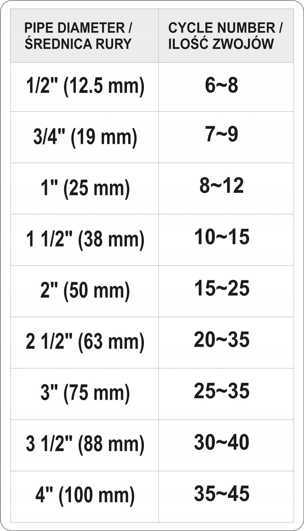 В таблице ниже показано рекомендуемое количество витков для каждого диаметра трубы.
