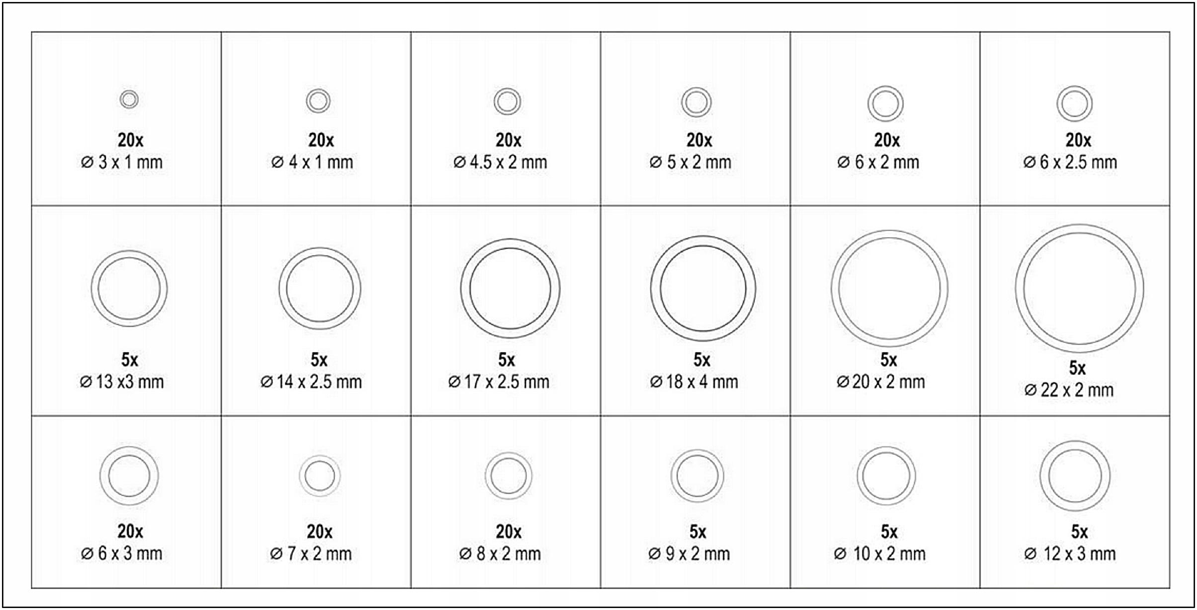 Практичный набор из 25 уплотнительных колец разных размеров. Уплотнительные кольца изготовлены из резины HNBR. Практичная упаковка обеспечивает легкий доступ к удобному размеру.