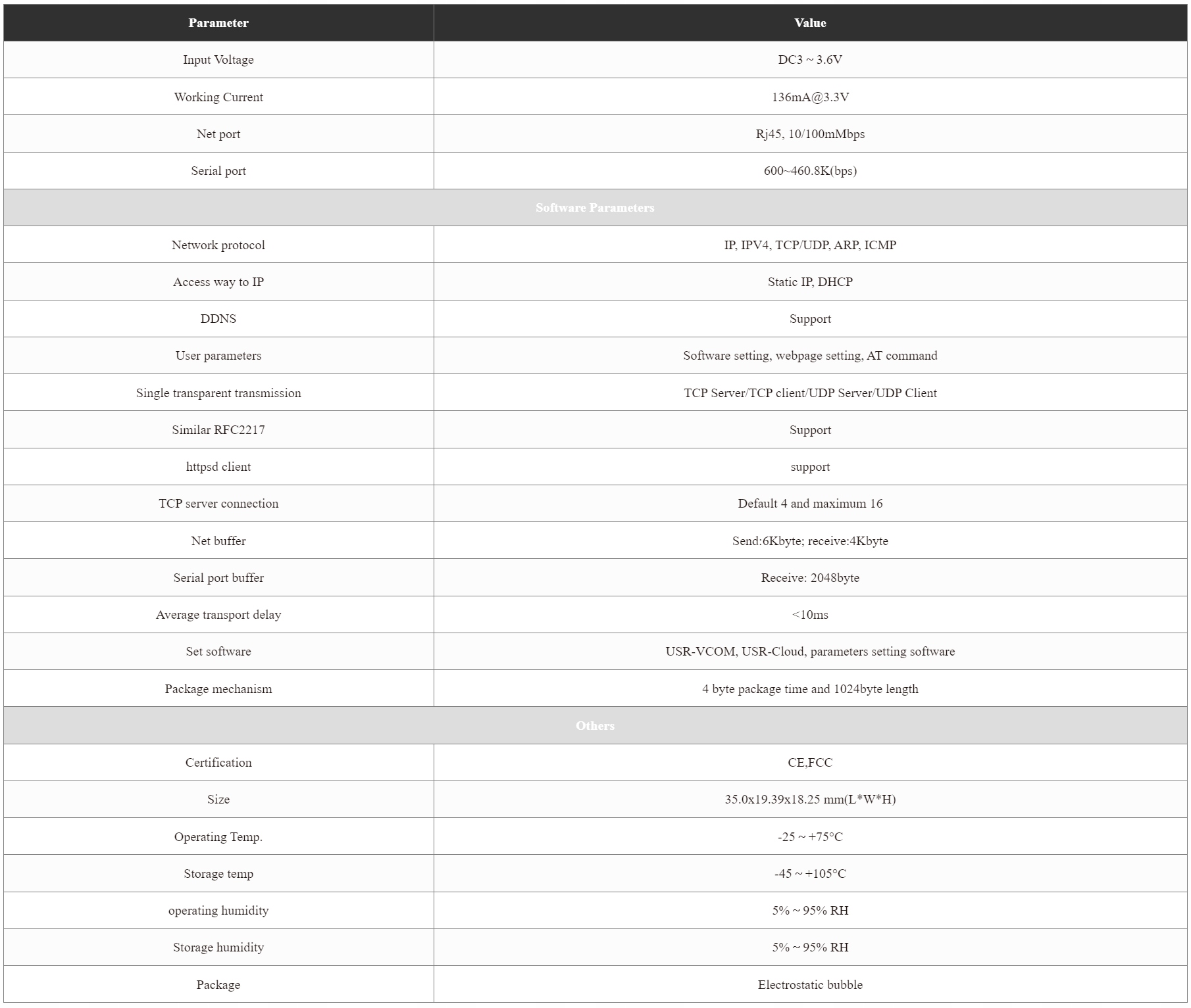 USR K6 — это небольшой модуль последовательного порта Ethernet, который обеспечивает прозрачную двунаправленную передачу данных между портом RJ45 и последовательным портом TTL. Может использоваться для протоколов RS 232 и RS 485 благодаря схеме преобразования уровня. Поддерживает низкое энергопотребление, потребляет лишь небольшой ток при работе на полной скорости. Он оснащен ядром Cortex M0, обеспечивающим скорость и высокую производительность. Он предлагает несколько функций для удовлетворения большего количества потребностей. K6 прост в использовании и обладает высокой совместимостью. Благодаря добавлению новых функций он совместим с протоколом настройки K5, что упрощает работу пользователей более старых версий. При этом был добавлен протокол настройки, аналогичный K3. Для клиентов, использующих другие серии продуктов, K6 можно использовать только с простыми настройками.