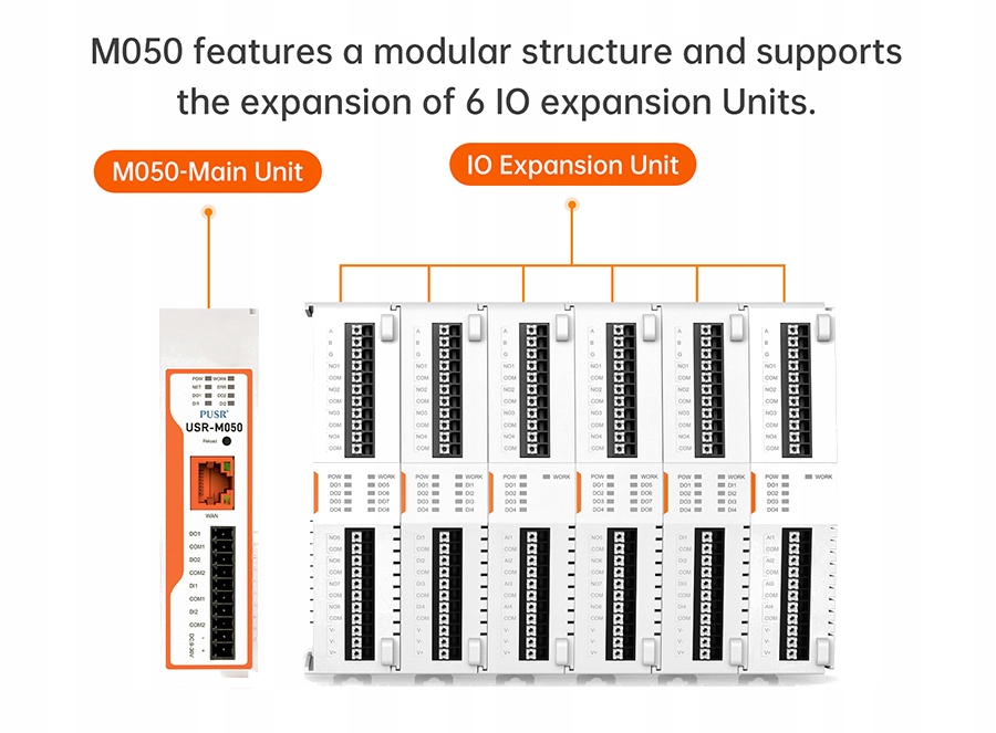 - Масштабируемость – до 6 модулей расширения × 8 IO (смесь DI/DO/AI/AO) + встроенный 2DI/2DO → 52 ввода-вывода макс.