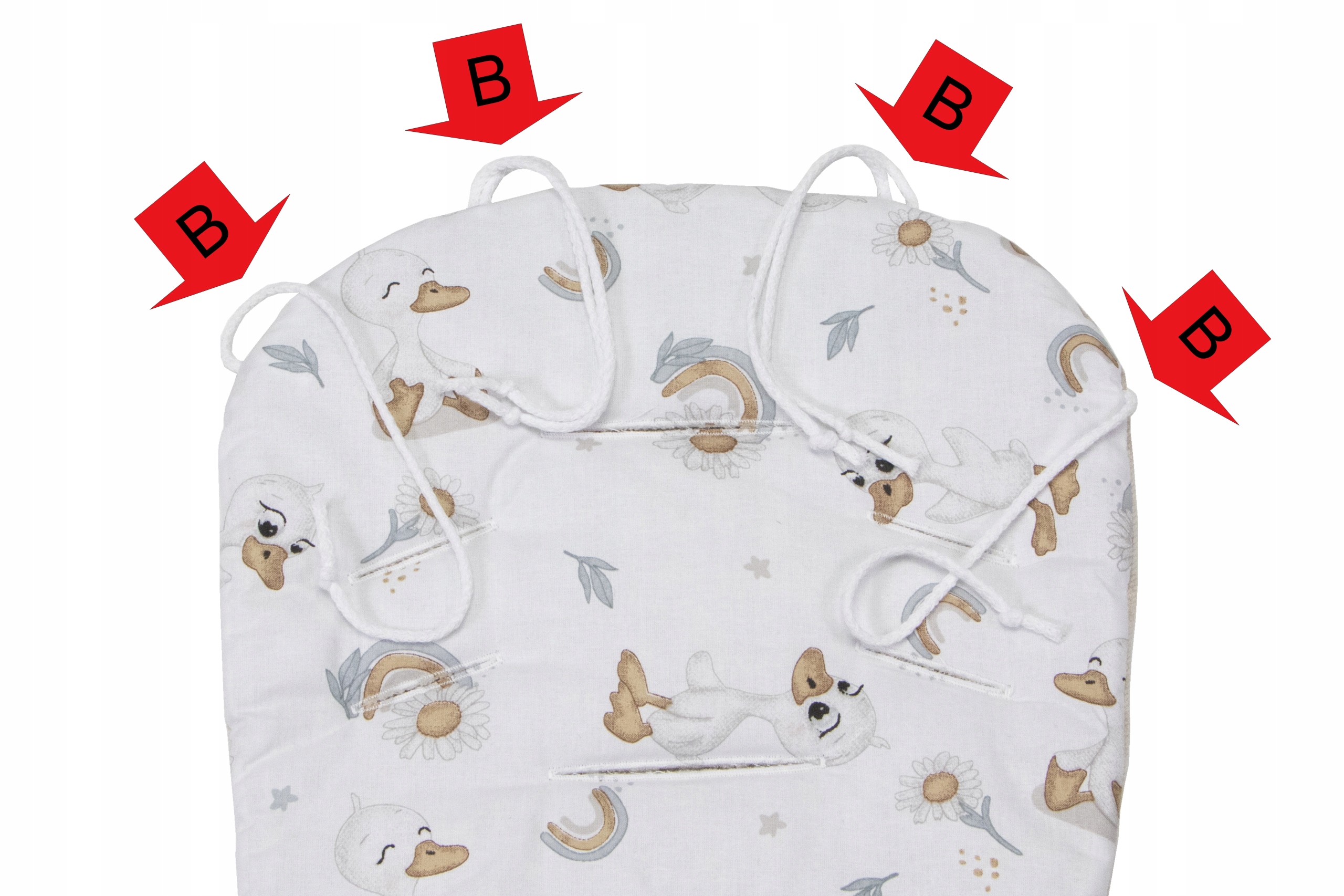 B-Вшитые ремни позволяют прикрепить вставку к спинке коляски, что предотвращает соскальзывание вставки с сиденья.