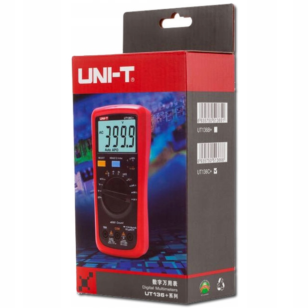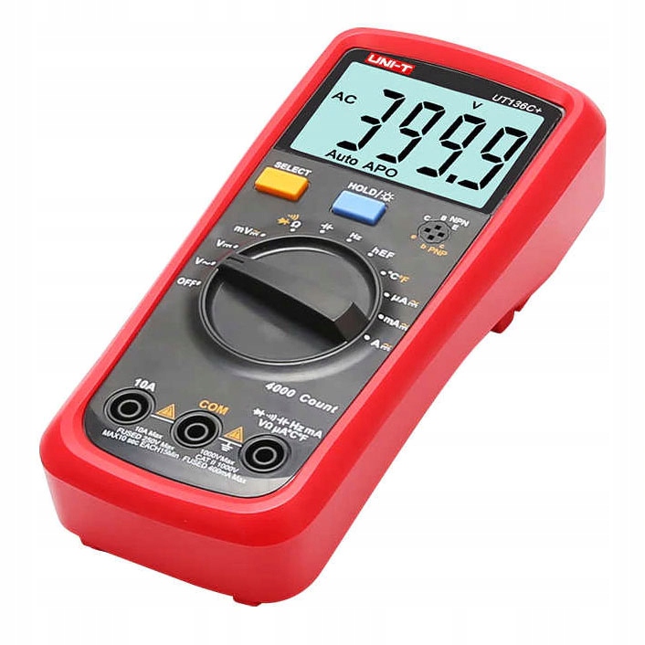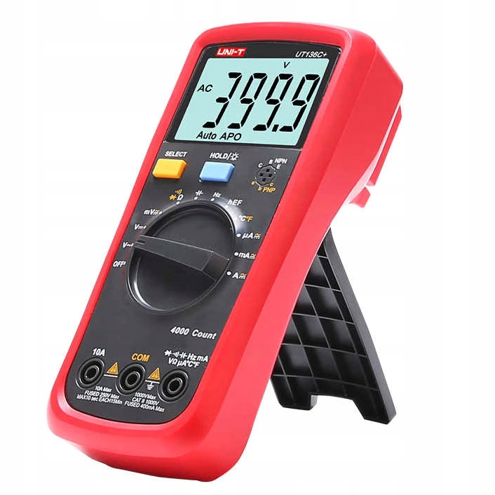 UT-136C+ — портативный универсальный цифровой мультиметр производства известной компании Uni-t. Это цифровой измеритель с автоматическим изменением диапазонов измерения. Имеет цифровой жидкокристаллический дисплей с дополнительной подсветкой. Максимальное отображение 3999 гарантирует достаточное разрешение во всех диапазонах измерения. UT136C+ позволяет измерять следующие физические величины: напряжение, постоянный и переменный ток, измерение электрического сопротивления, то есть сопротивления, измерение частоты и рабочего цикла формы сигнала. Среди дополнительных функций измерения, предлагаемых счетчиком UT136C+, имеется акустический тестер непрерывности, так называемый «зуммер», функция проверки – проверка полупроводниковых диодов. Дополнительным преимуществом цифрового счетчика UT136C+ является индикатор разряженной батареи, поскольку электрические измерения, выполняемые прибором с разряженной батареей, могут иметь большую погрешность измерения (плохую индикацию).