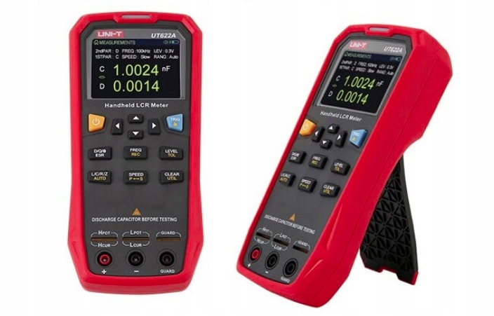 UT622E LRC представляет собой ручной измеритель компонентов - катушек, резисторов и конденсаторов и их вторичных свойств: D (коэффициент потерь), Q (добротность), Θ ( фазовый угол в градусах), Θ (фазовый угол в радианах) и ESR (эквивалентное последовательное или параллельное сопротивление). Параметры компонентов измеряются переменным напряжением с выбираемой частотой 100, 120, 1000, 10000 Гц и выбираемой амплитудой 0,1 В, 0,3 В, 1,0 В, с выходным сопротивлением источника сигнала 100 Ом. Высочайшая точность измерения составляет 0,1%.