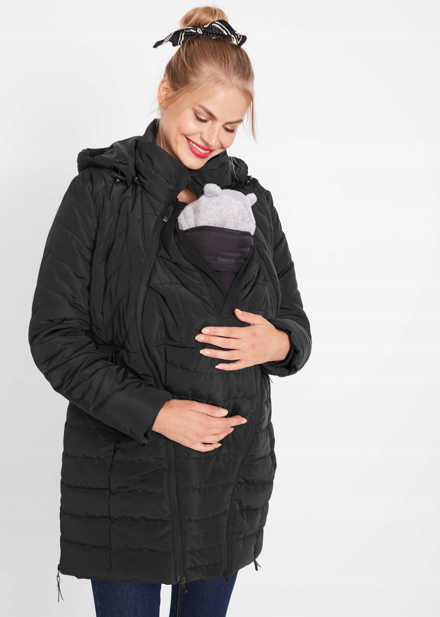 Застегивается на молнию, со съемным капюшоном с лямками на молнии. Два кармана по бокам, молнии в боковых швах, позволяющие расширить пальто. Куртка носить во время беременности и после родов. На подкладке, слегка утепленный, скорее переходный. Рукава с трикотажными манжетами. Завязки на талии внутри куртки.