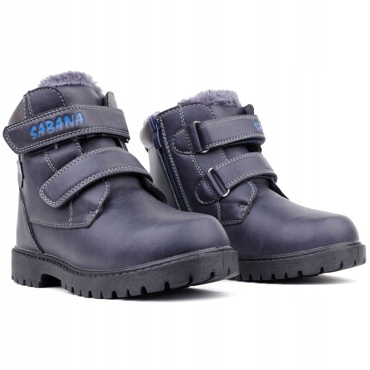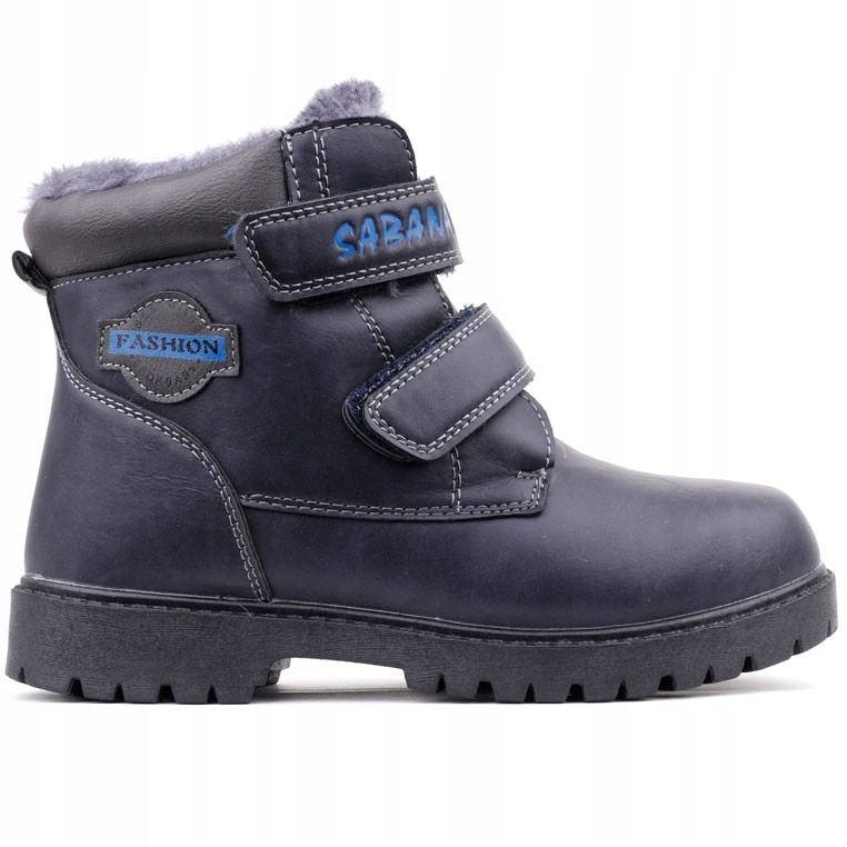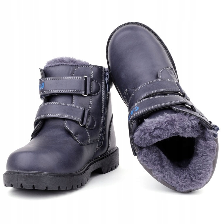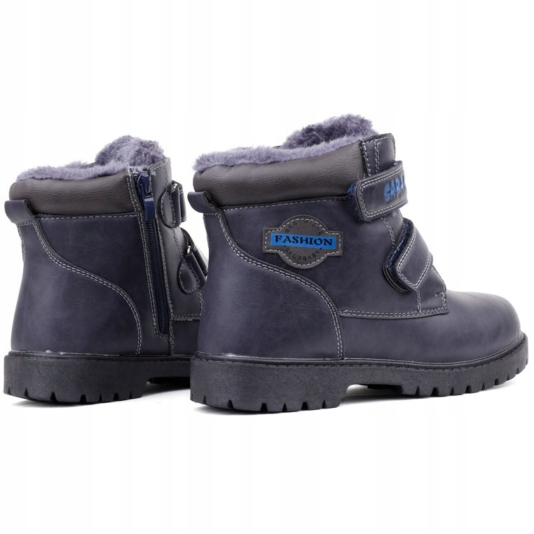 Ботинки для мальчиков, на плоской толстой подошве и протекторе. Изготовлен из экокожи. Верх усилен вставкой другого цвета по самому краю. Застегивается на молнию внутри, две застежки-липучки спереди. Сильно изолирован. Зимние ботинки пригодятся для зимних прогулок.