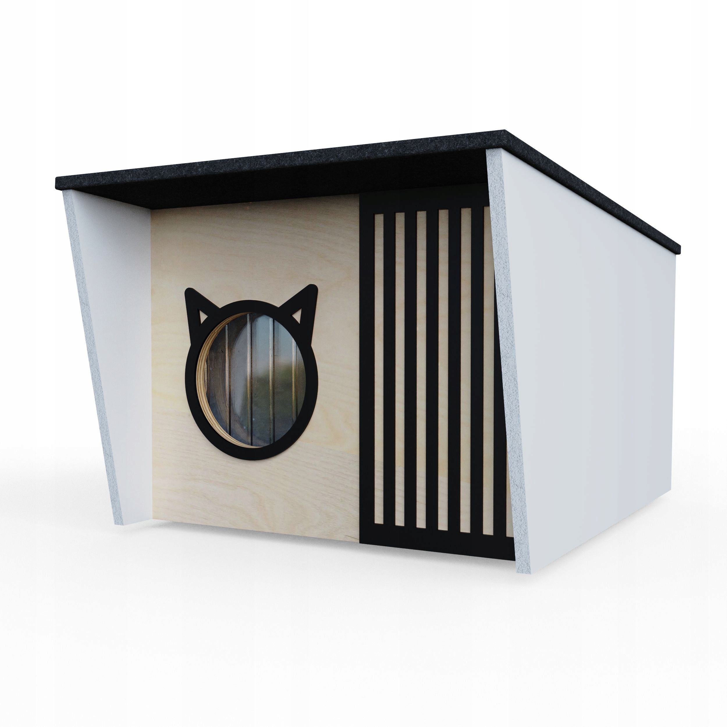 Конура герметична. Защищает от ветра, дождя, снега и мороза. Его крыша открывается. В нем могут разместиться как минимум 2 большие кошки или несколько кошек поменьше. Он изготовлен из водонепроницаемой фанеры твердых пород и имеет внутри коробку из пенопласта. Поэтому можно сказать, что вся кабинка утеплена.
