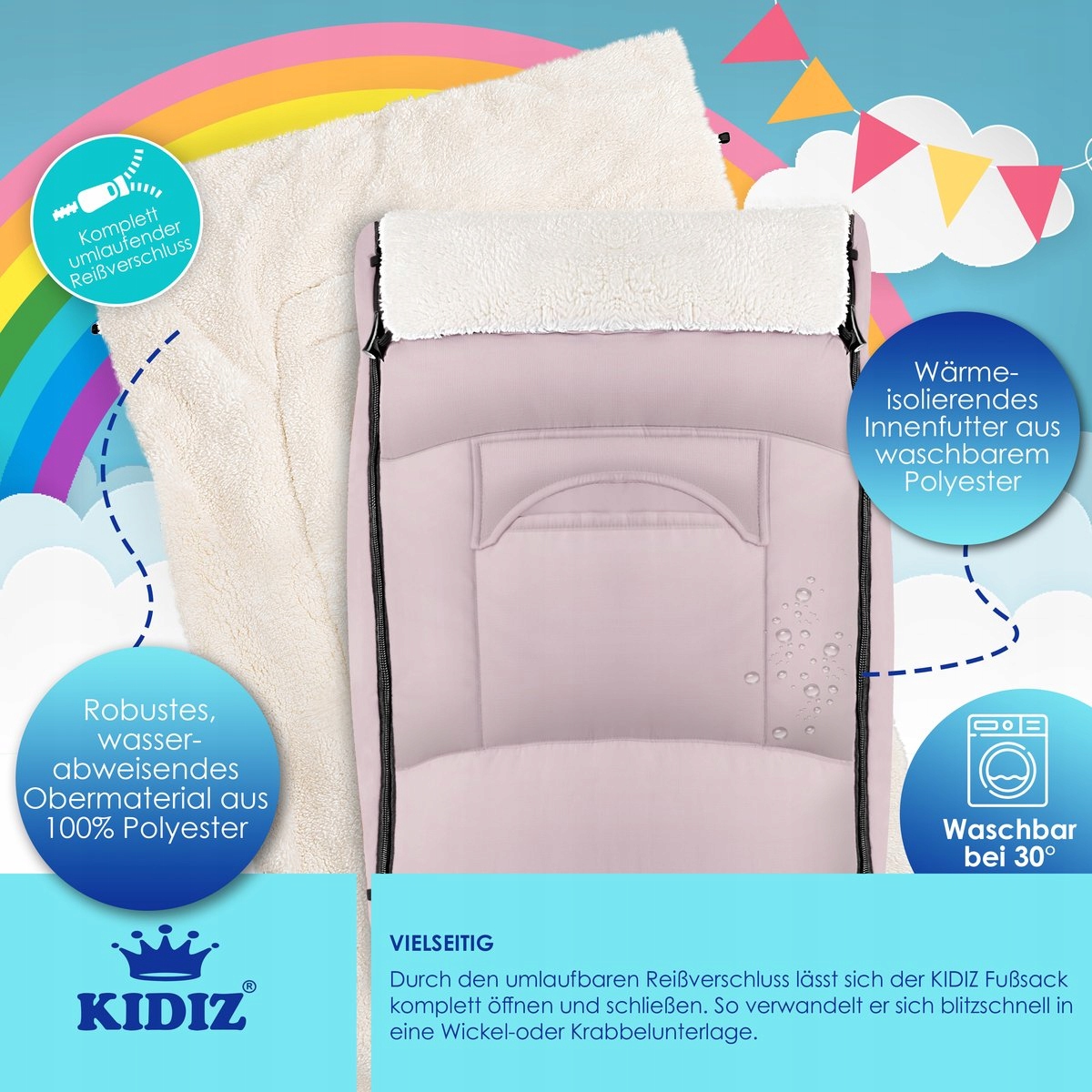 - ➡️ Спальный мешок KIDIZ UniversalThermo обеспечит вашему ребенку защиту и тепло. В то же время он придает вашей коляске спортивный вид.