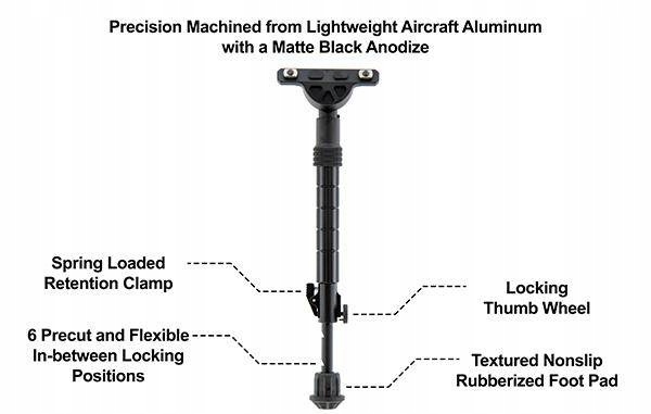 Складывается разнообразные из воздуха, анодированный алюминий в структуре складывания. Материал устойчив к неблагоприятным погодным условиям. Механизм заблокирован в пяти позициях, можно сложить его вдоль линии оружия, а ноги установлены на положениях 3 и 9.