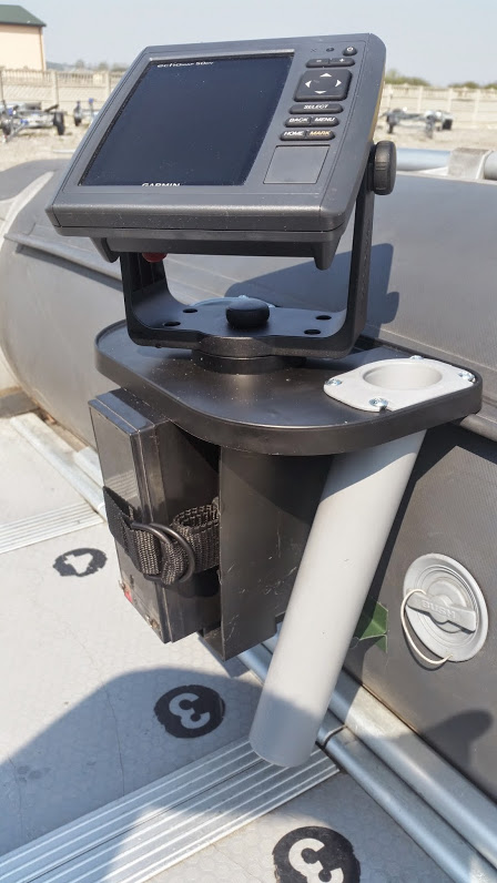 КОНСТРУКЦИЯ РУЧКИ ОБЕСПЕЧИВАЕТ НАДЕЖНОЕ И ПРОЧНОЕ КРЕПЛЕНИЕ ЭКРАНА ЭХОЗОНДА, КОТОРЫЙ ПРИКРЕПЛЯЕТСЯ К ВЕРХНЕЙ СТОЛИКЕ РУЧКИ, НИЖНЯЯ ПОЛКА ПРЕДУСМОТРЕНА ДЛЯ АККУМУЛЯТОРА (ДЕРЖИТЕ СТАНДАРТНЫЙ АККУМУЛЯТОР ЕМКОСТЬЮ 7 Ач. ЗАКРЕПЛЯЙТЕ РЕМНЕМ.