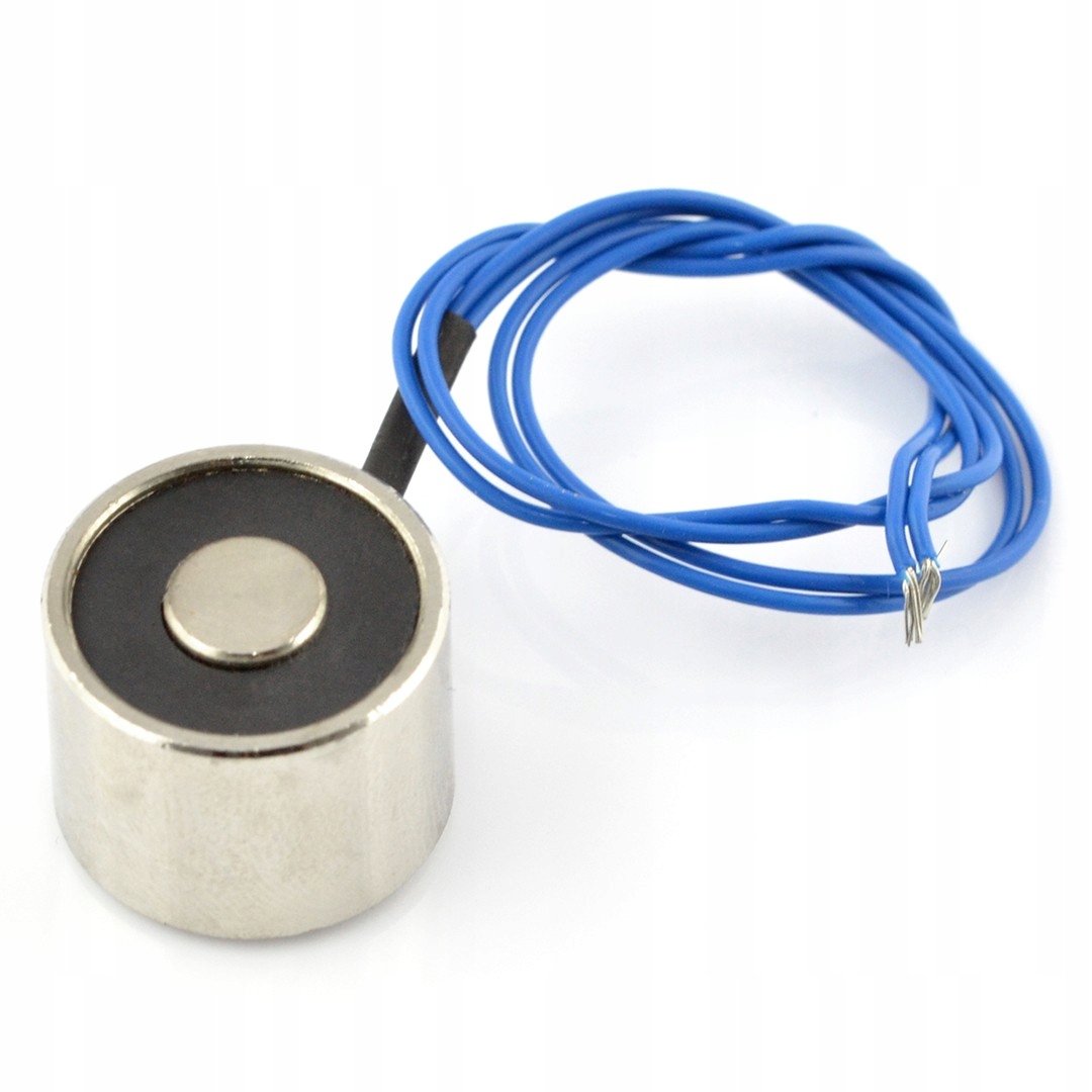 Удерживающий электромагнит 12 В, 3,5 Вт. Удерживает массу 4 кг при стандартном ускорении свободного падения 9,8 м/с2. Диаметр корпуса 25 мм, высота 20 мм, для сборки использовано отверстие с резьбой М3.