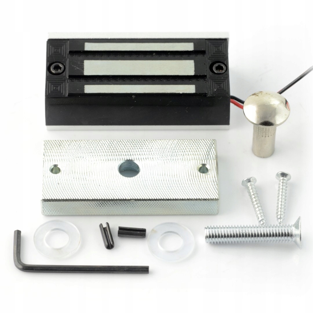 Удерживающий электромагнит питается напряжением 12 В. Выдерживает массу 60 кг со стандартным ускорением свободного падения 9,8 м/с2. Размеры электромагнита 80 х 38 х 23,6 мм. В комплект входит набор крепежных винтов.