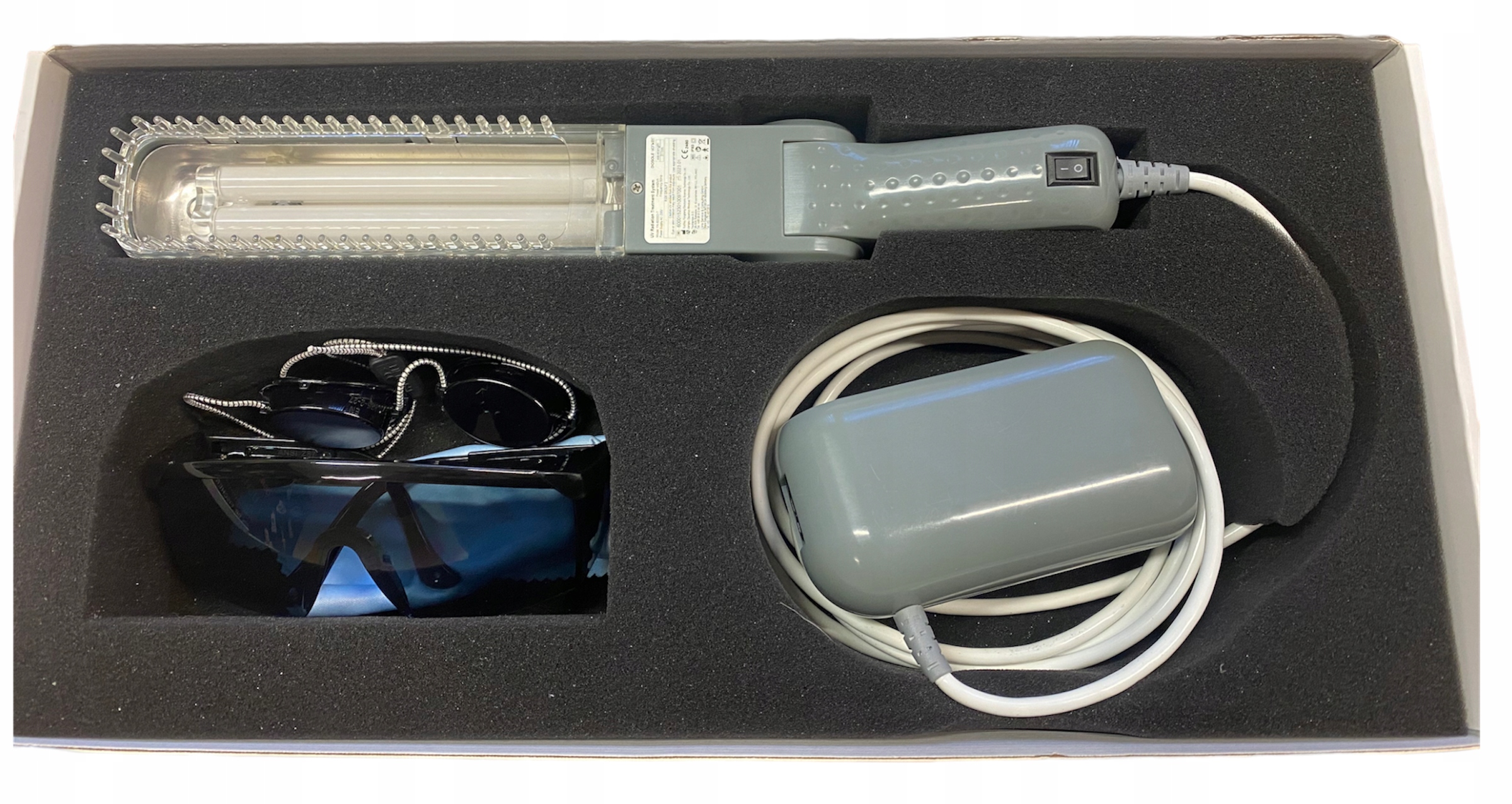 Лампа с расческой, установленная Philips медицинская люминесцентная лампа PL-S 9W/01 2P G23d 230В UVB 311нм, черные очки 2 шт (большие и меньшие, точнее) защищающие от УФ-лучей. Автоматический режим: После запуска счетчик отсчитывает время согласно настройкам (по истечении установленного времени лампа автоматически выключается).