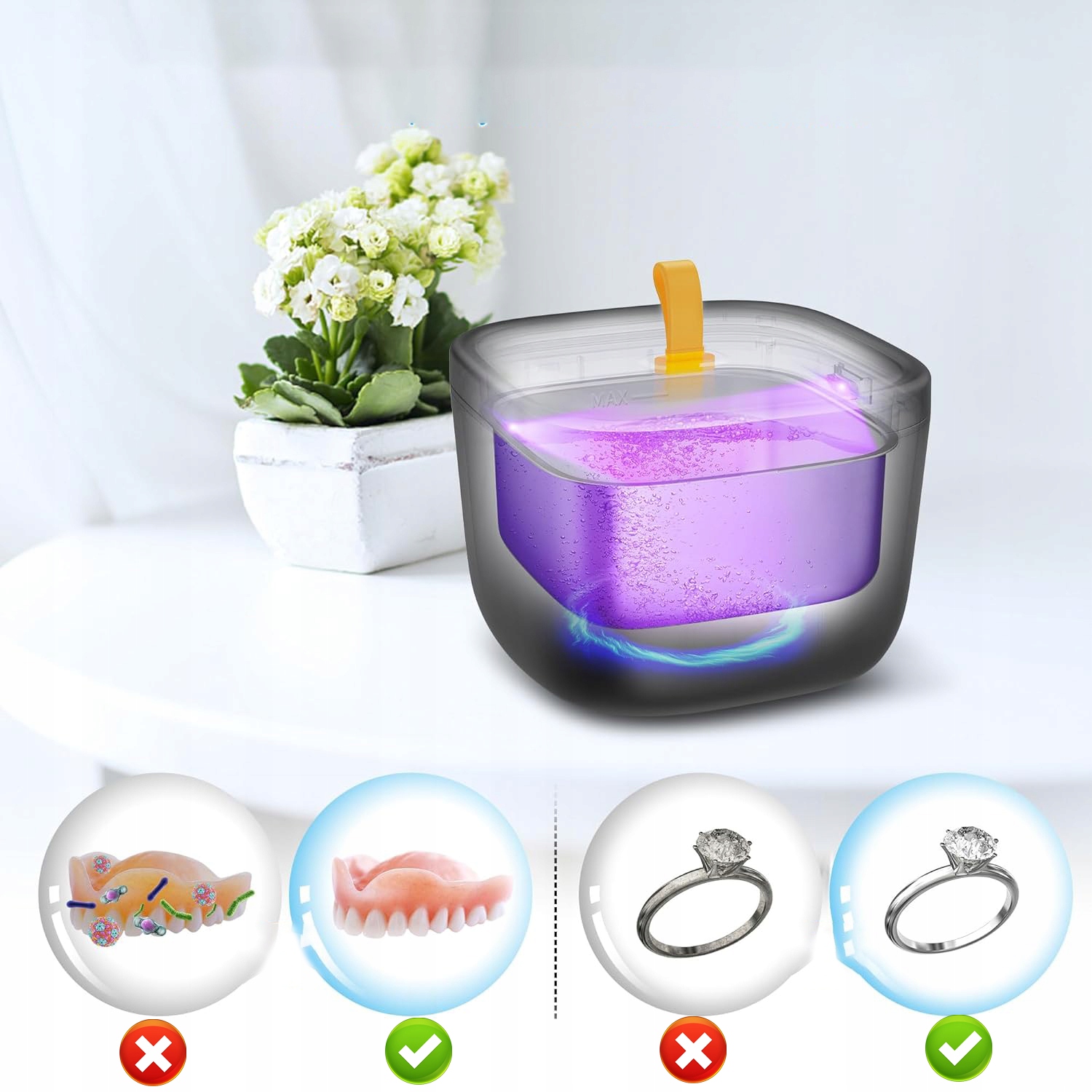 - Мы гарантируем глубокую и эффективную чистку зубных протезов, зубных протекторов, брекетов, ортодонтических аппаратов, отбеливающих накладок, капп, капп и даже ювелирных изделий