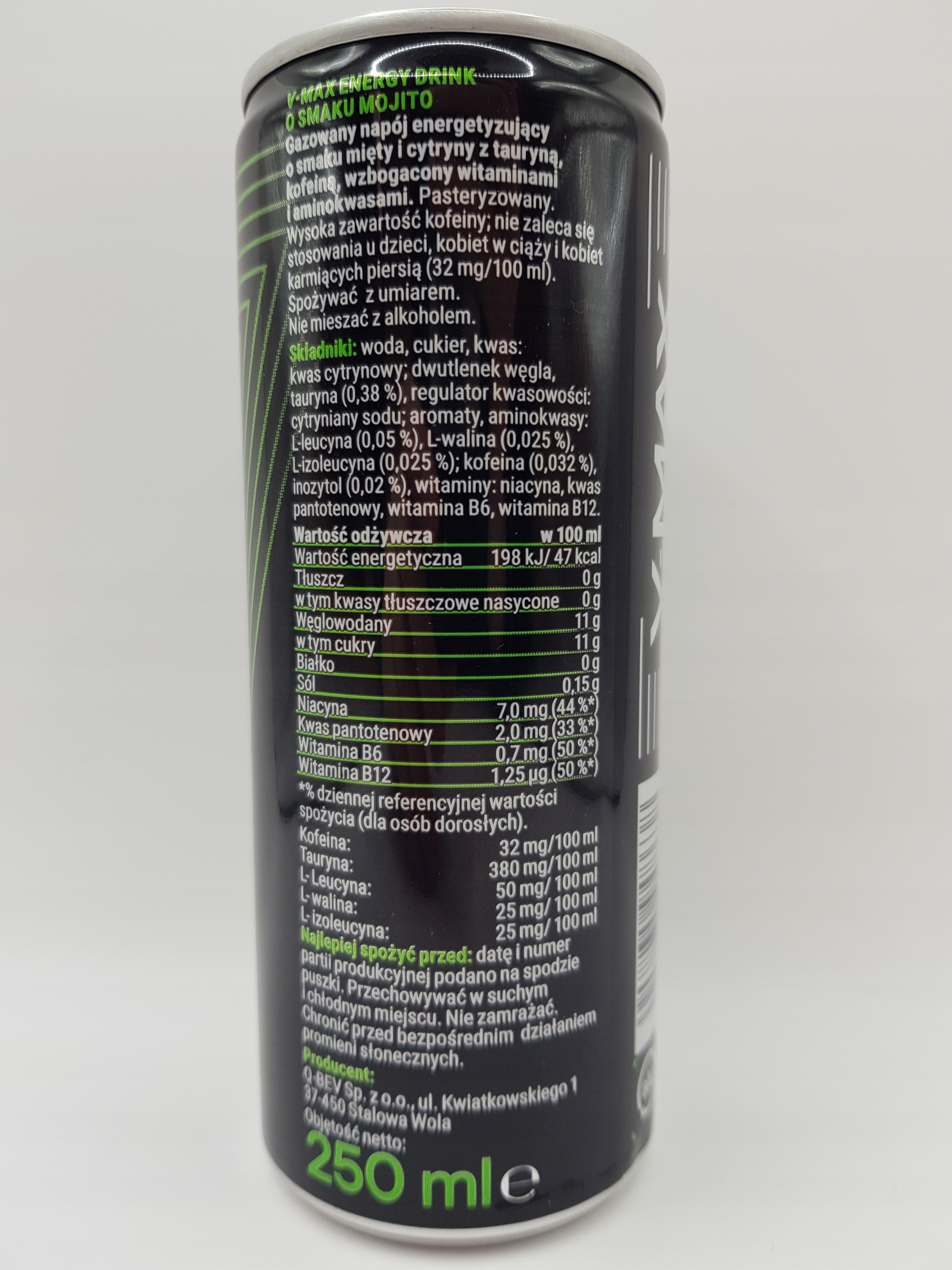 Ingredients: water, sugar, acid: citric acid, carbon dioxide, taurine (0.38 %), acidity regulator: sodium lemon, aromas, amino acids: L-leucine (0.05 %), L-Walina (0.025 %), L-isoleucucin (0.025 %) ,, caffeine (0.032 %), inositol (0.02 %), vitamins: niacin, pantotenic acid, vitamin B6, vitamin B12
