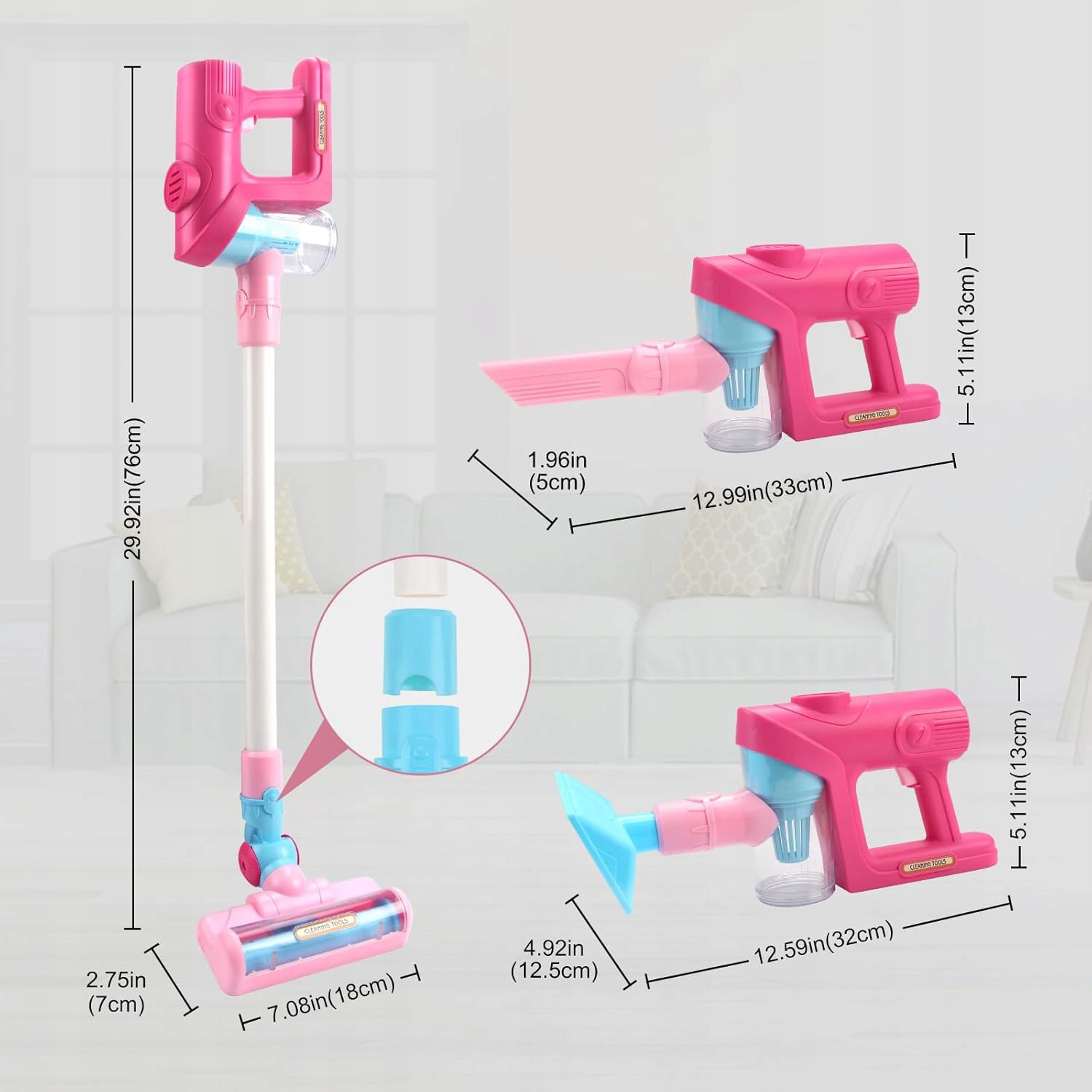 Игрушечный пылесос изготовлен из высококачественного АБС-материала, который безопасен, нетоксичен и не имеет запаха. Соответствующий размер и ручка позволяют детям легко и без нагрузки толкать его.