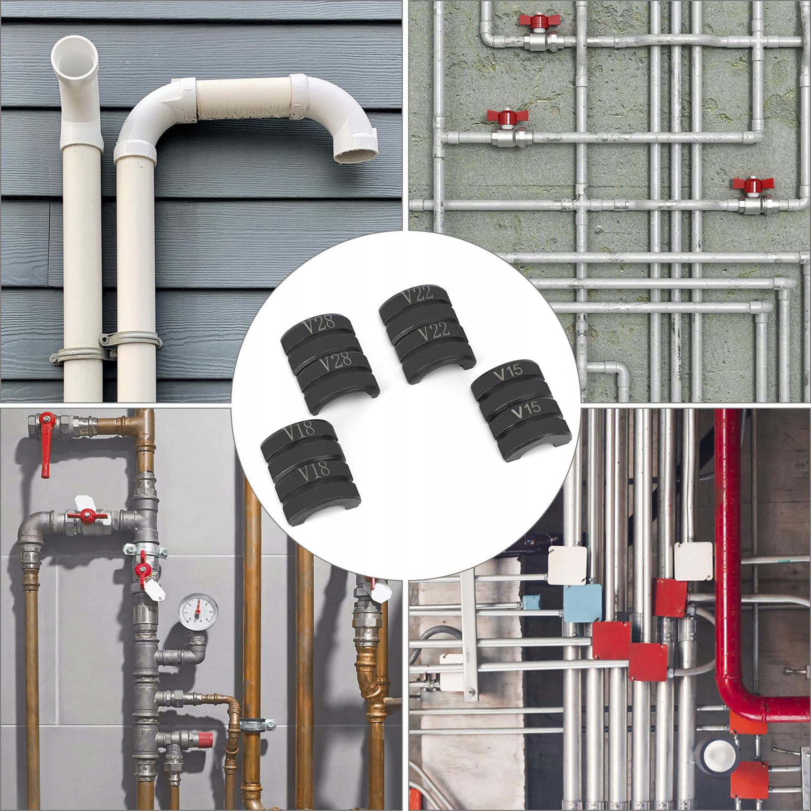 В комплект входят штампы (V15 мм, V18mm, V22mm, V28mm), которые в основном используются для зажима труб из нержавеющей стали и могут использоваться в различных отраслях промышленности, таких как мостостроение, энергетика, судостроение и строительство.