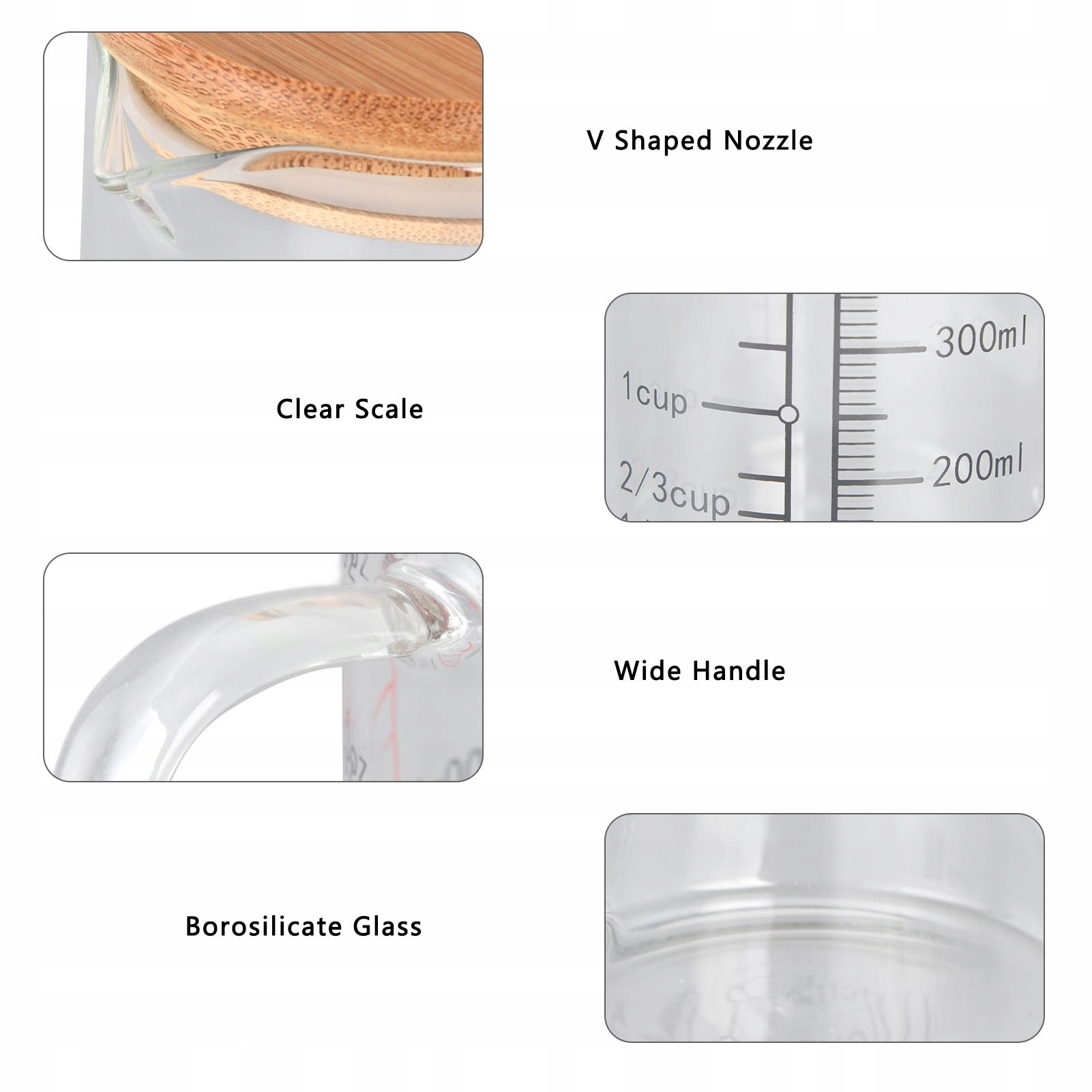 Особенность:1. [V-образная насадка. Конструкция сопла] Стеклянный мерный стакан имеет V-образную форму сопла для более быстрой струи воды. Широкая ручка, удобная ручка, подходит для любого типа кастрюли.