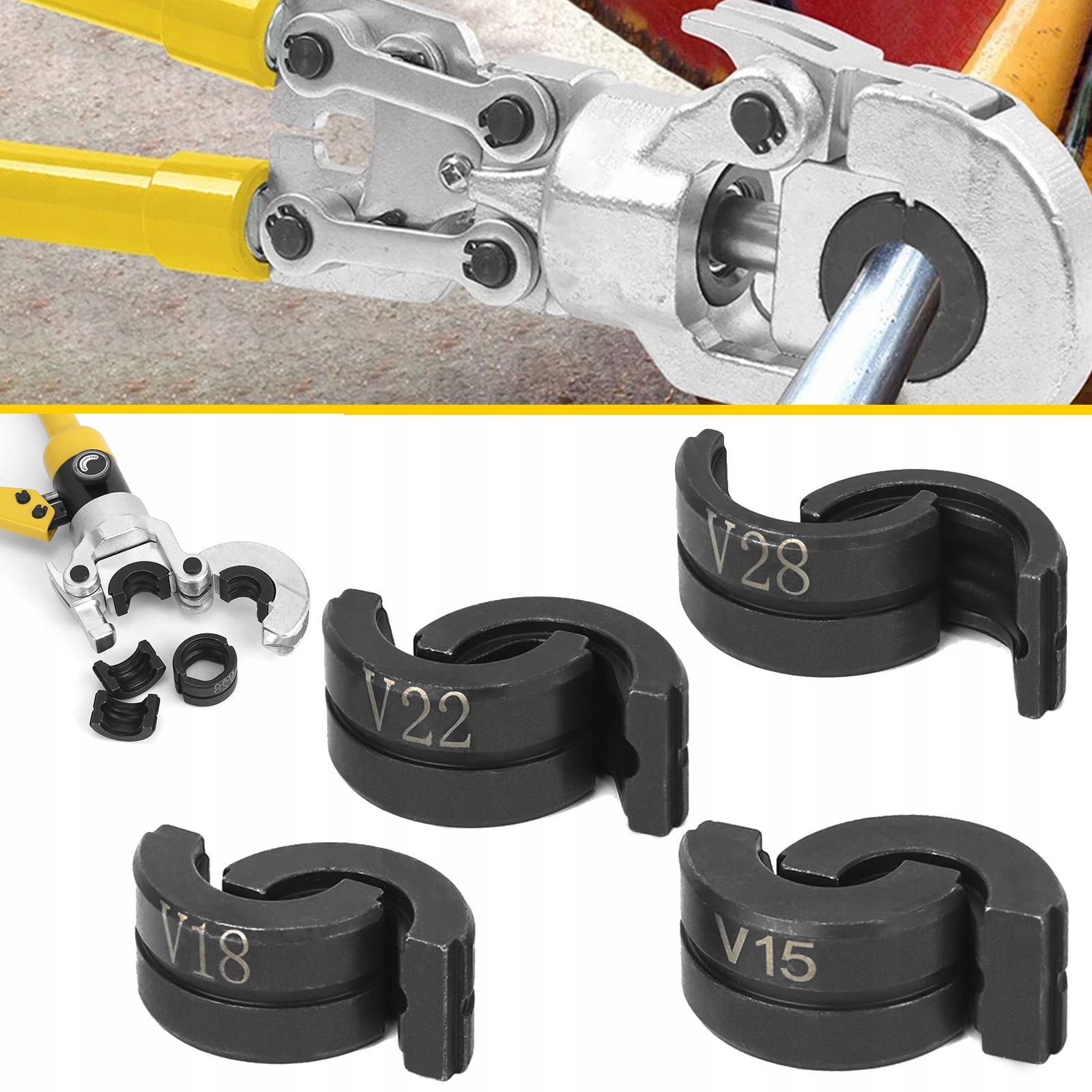 В комплект входят штампы (V15 мм, V18mm, V22mm, V28mm), которые в основном используются для зажима труб из нержавеющей стали и могут использоваться в различных отраслях промышленности, таких как мостостроение, энергетика, судостроение и строительство.