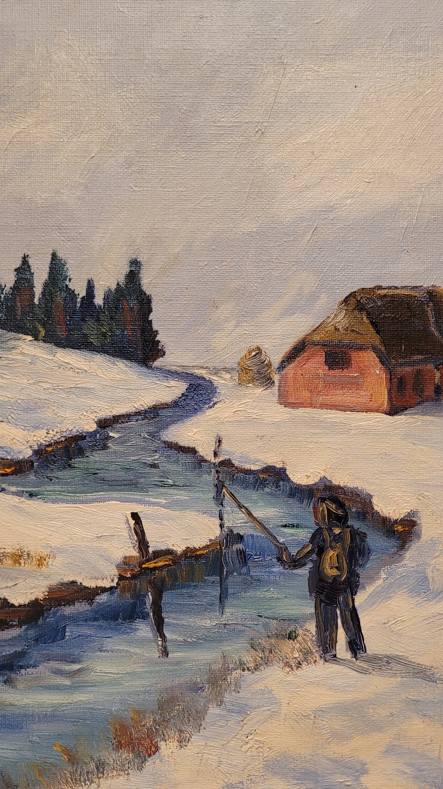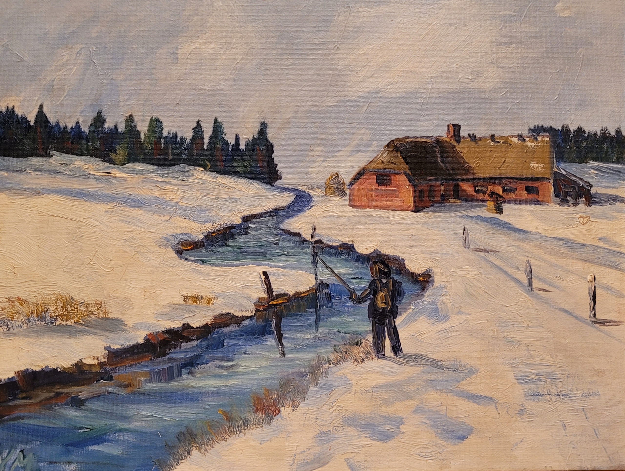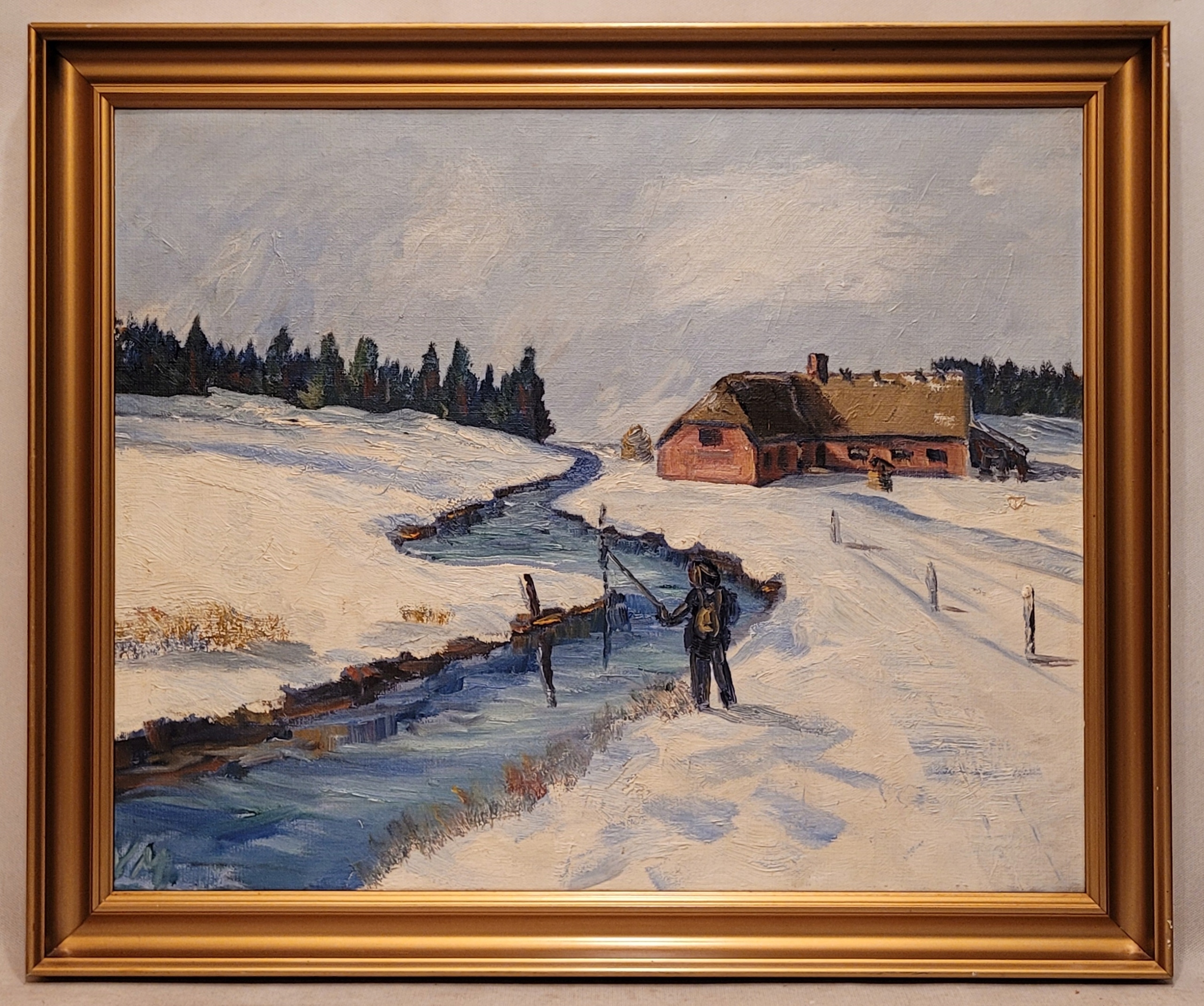 Предмет продажи - красивая, старинная картина маслом "ЗИМОЙ НА РЫБАЛКЕ".