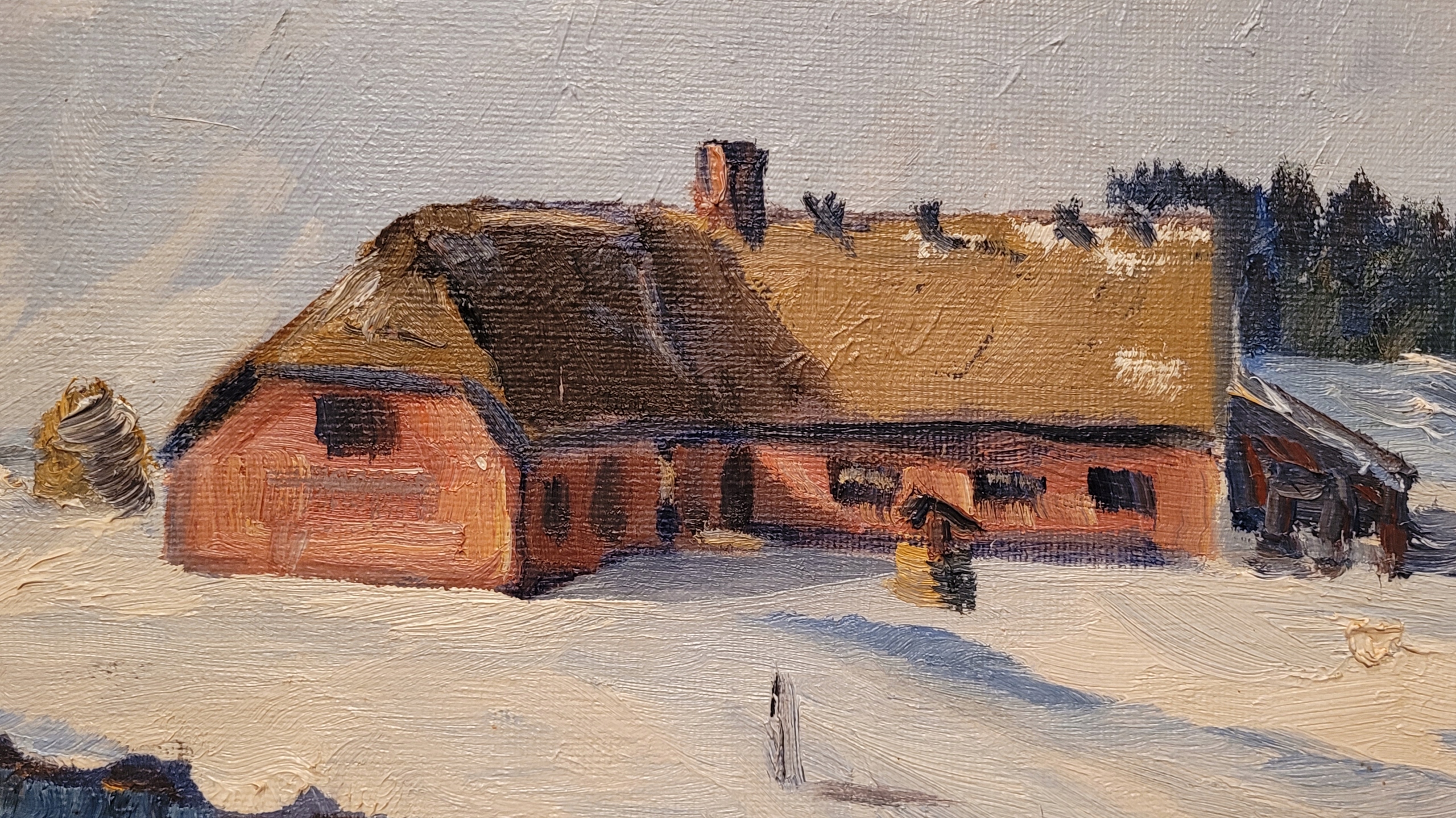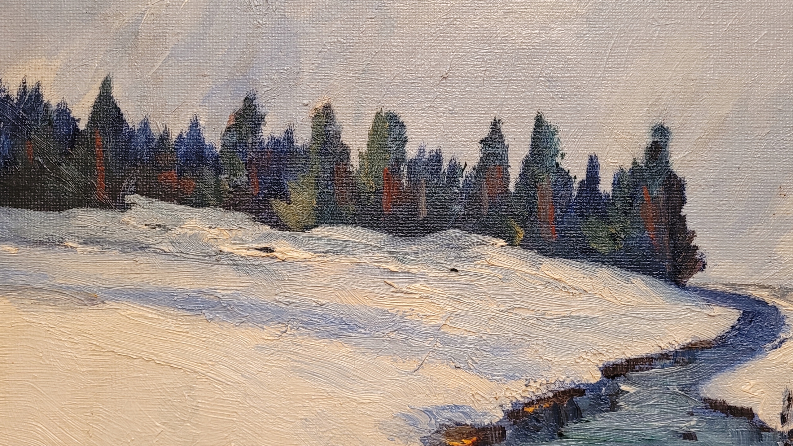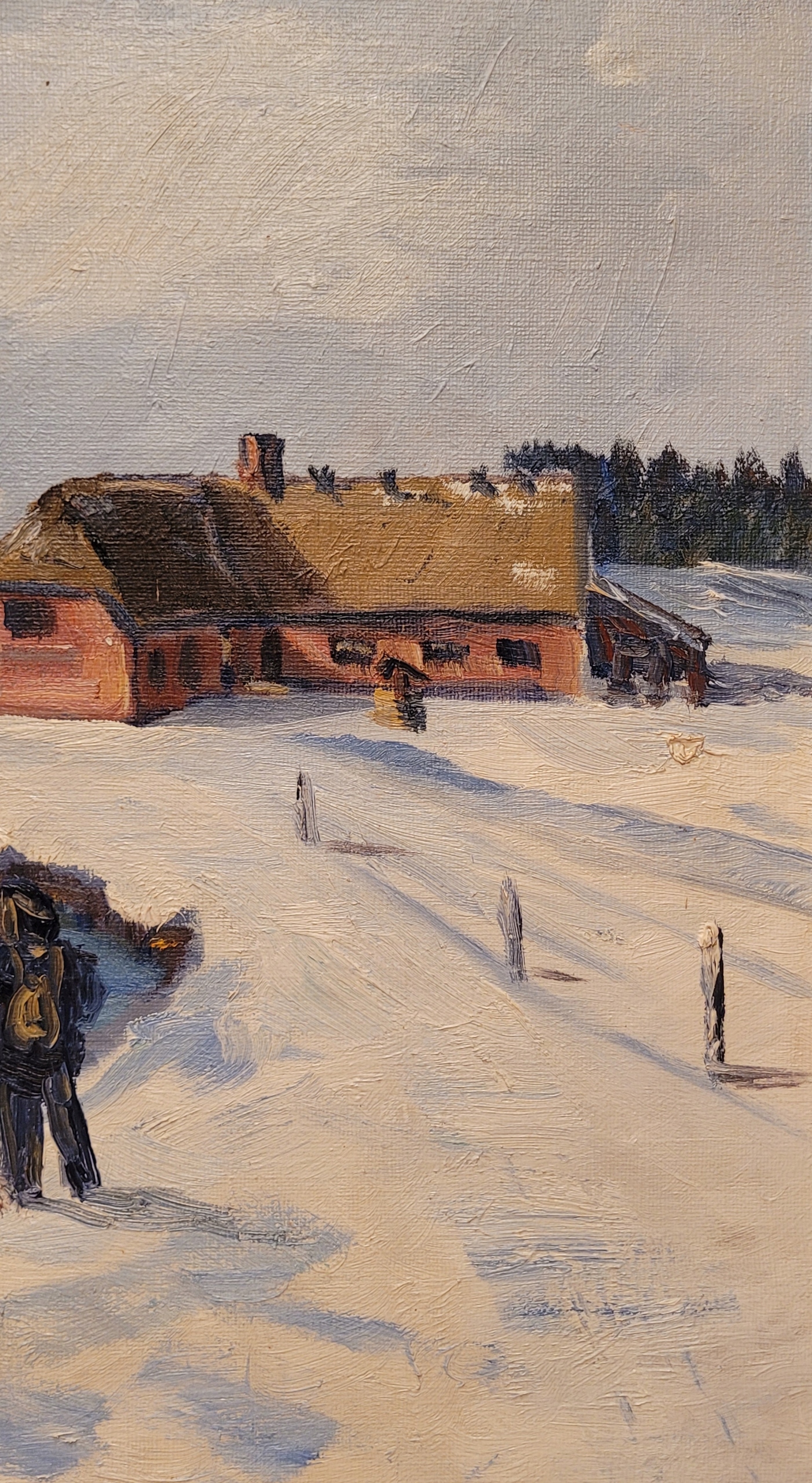 Предмет продажи - красивая, старинная картина маслом "ЗИМОЙ НА РЫБАЛКЕ".