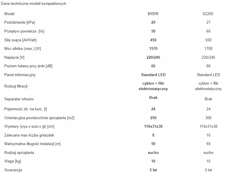 Центральные блоки S1570 оснащены одним двигателем с диаметром ротора 5,7". Пылесосы предназначены для домашнего использования, конструкция которых заимствована из решений, встречающихся в промышленных сооружениях. Эти пылесосы могут убирать дома с общая площадь 300 м2 и 500 м2 соответственно.Двигатели центрального блока S1570 можно подключить параллельно одному сепаратору DC1240 для увеличения расхода воздуха.Это решение позволяет добиться очень высокой эффективности системы по привлекательной цене.