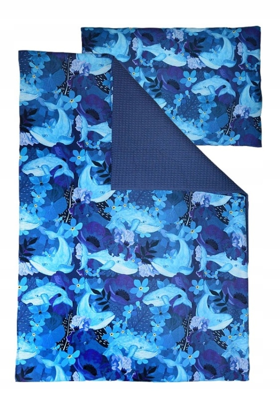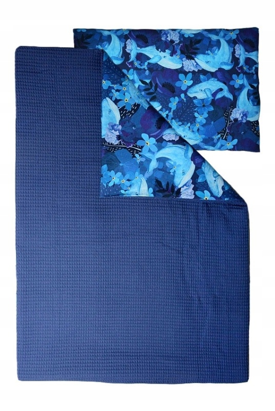 И одеяло, и подушка имеют вафельный хлопок с одной стороны и принтованный хлопок с другой.