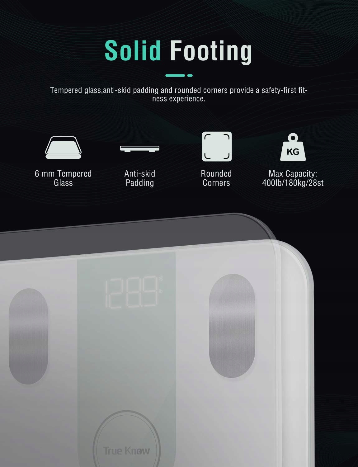 Bluetooth Body Fat Scale, True Know Digital Digital Wanb Want BMI, анализатор композиции тела с применением смартфона, интеллектуальным беспроводным весом для взвешивания жира, 180 кг/28 -й/396 фунтов (белый)