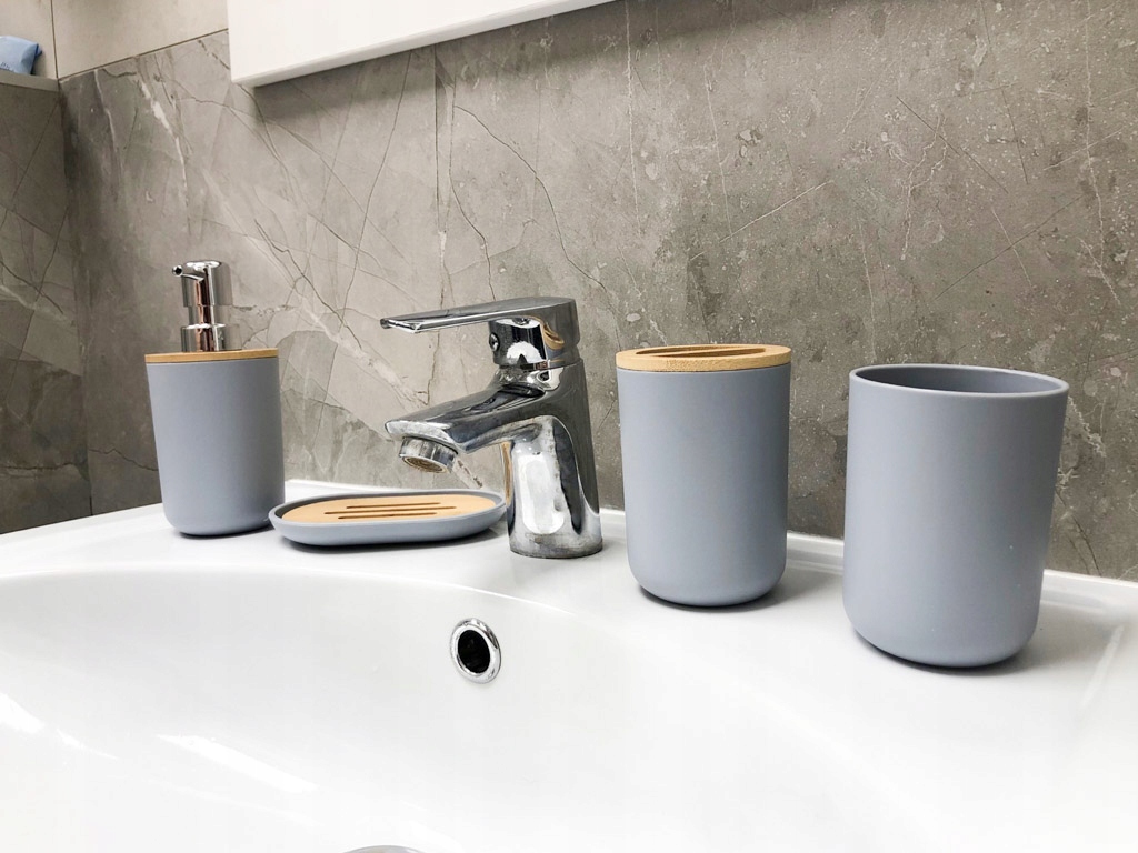 В комплект включает в себя: дозатор мыла, контейнер для Зубные щетки, мыльное дерево, кружка, туалетная щетка с контейнером и Ведотка.
