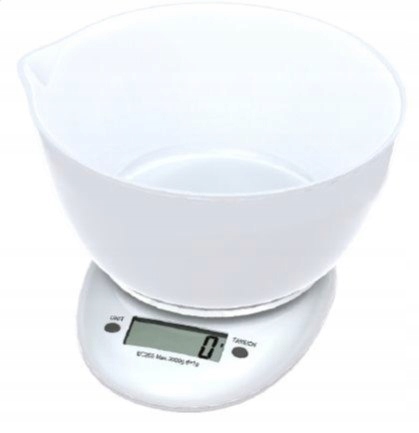Кухонные весы Максимальная нагрузка: 5 кг Классификация: 1 г Единицы: г, унция, фунт Объём чаши: 600 мл. ЖК-дисплей 49 x 19 мм Оснащен тензодатчиками. 2 х ААА (не входят в комплект) Автоматический обнуление и отключение Индикатор низкого заряда батареи и перегрузки