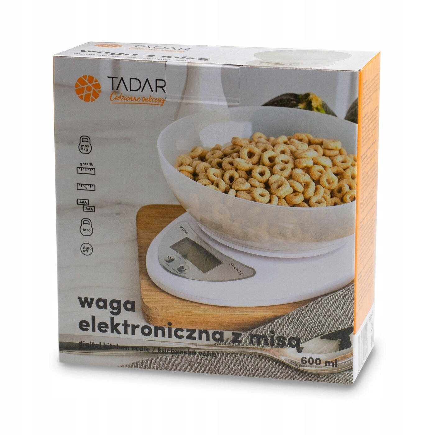 Электронные кухонные весы Tadar на 5 кг белого цвета, оснащены чашей объемом 600 мл. Такое решение облегчает взвешивание овощей, фруктов и сыпучих пищевых продуктов. Вы сделаете это до грамма. Модель также позволяет производить измерения в унциях и фунтах. Кроме того, он имеет функцию тарирования и индикатор перегрузки. Вся информация отображается на четком ЖК-дисплее. Батарейки, необходимые для питания изделия, в комплект не входят. Модель будет полезна при приготовлении пищи или выпечке. Это также удобно, гарантирует устойчивое положение на столешнице и не создаст проблем при хранении.